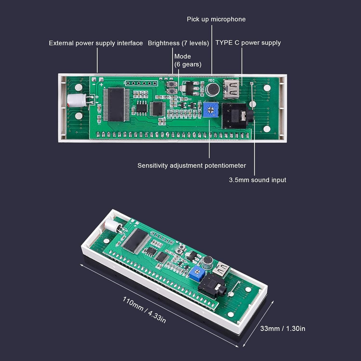Specification: Item Type: LED Music Spectrum Display Material: PCB Spectrum Range: 20Hz-25KHz Power Supply Interface: 1A Type C Sound Input: 3.5mm How to Use: Plug and play. PackageList: 1 x LED Music Spectrum Display 1 x USB Cable Notice: