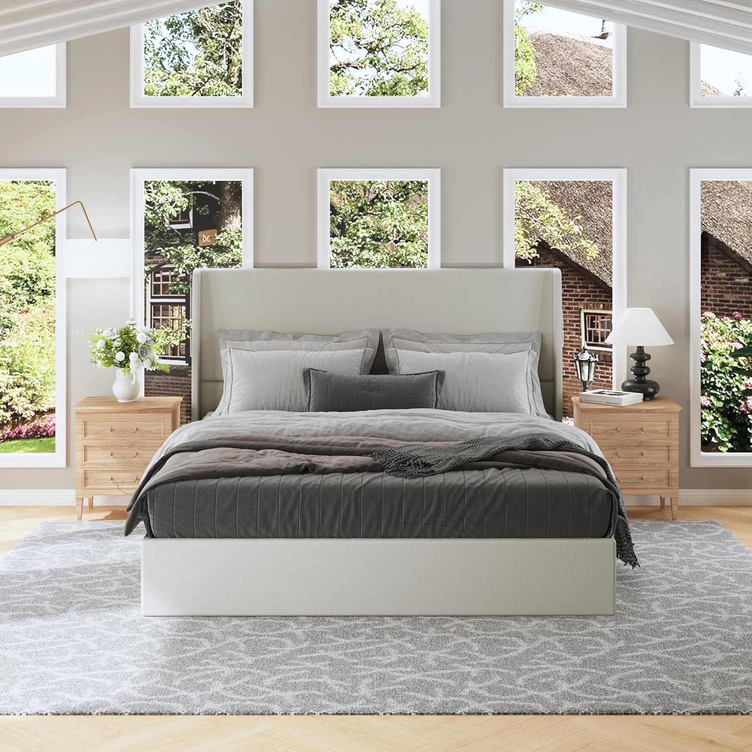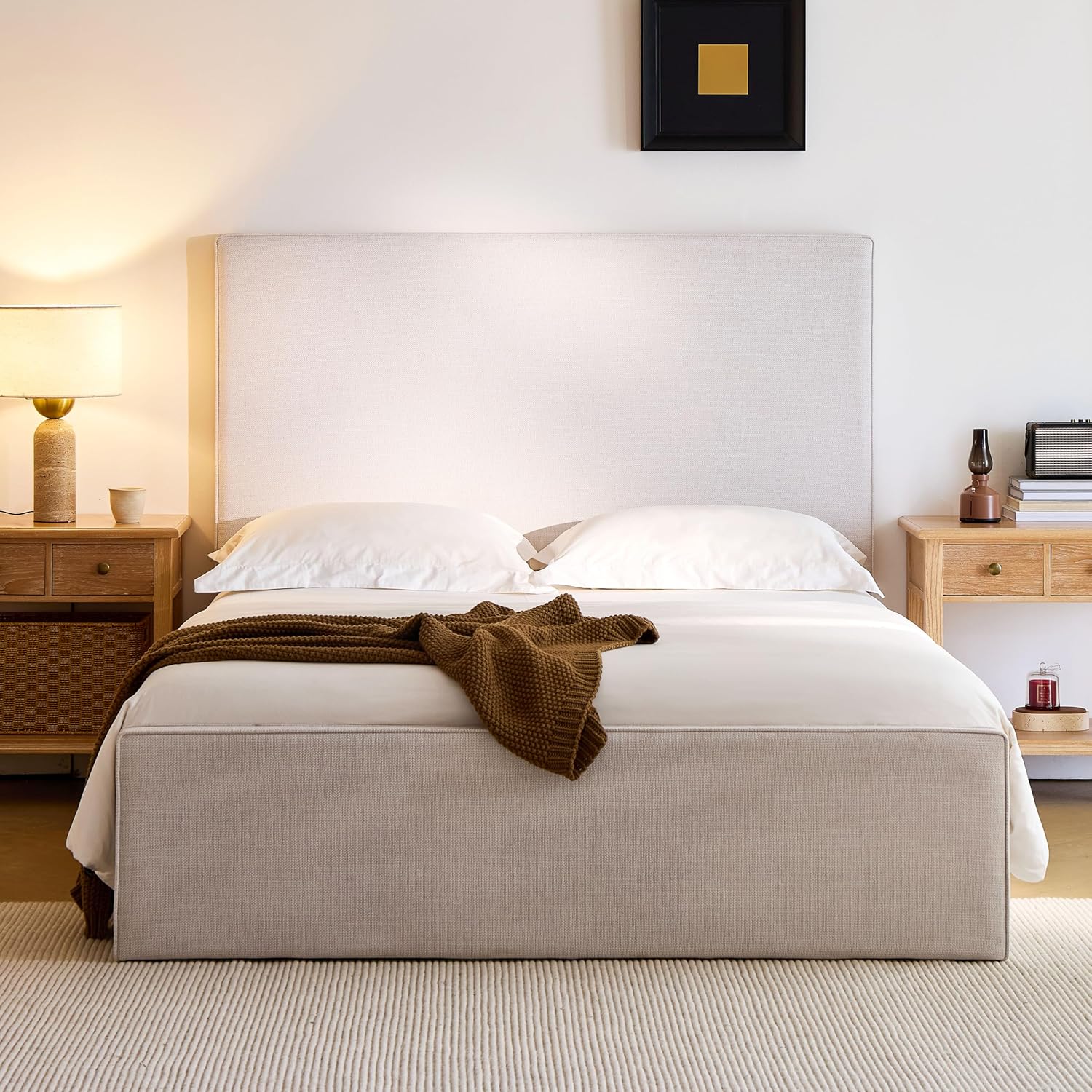 Specification:Color:BeigeMaterial:Chenille,Willow technology wood, Plywood,Solid woodBed Type:Platform BedSize: King/QueenSpring Box: No needProduct Dimension/Weight:King:83.07”L*77.95”W*50.78"H, 116.73lbsQueen:83.07”L*62.2"W*50.78"H, 102.73 lbsNumber of Bed Slats: 12pcsBed Weight Capability: 500lbsNotice1.Real Product's Color may be a little different from the image due to the lighting or monitor's display.Manual measurement has been used, there may be some reasonable error.