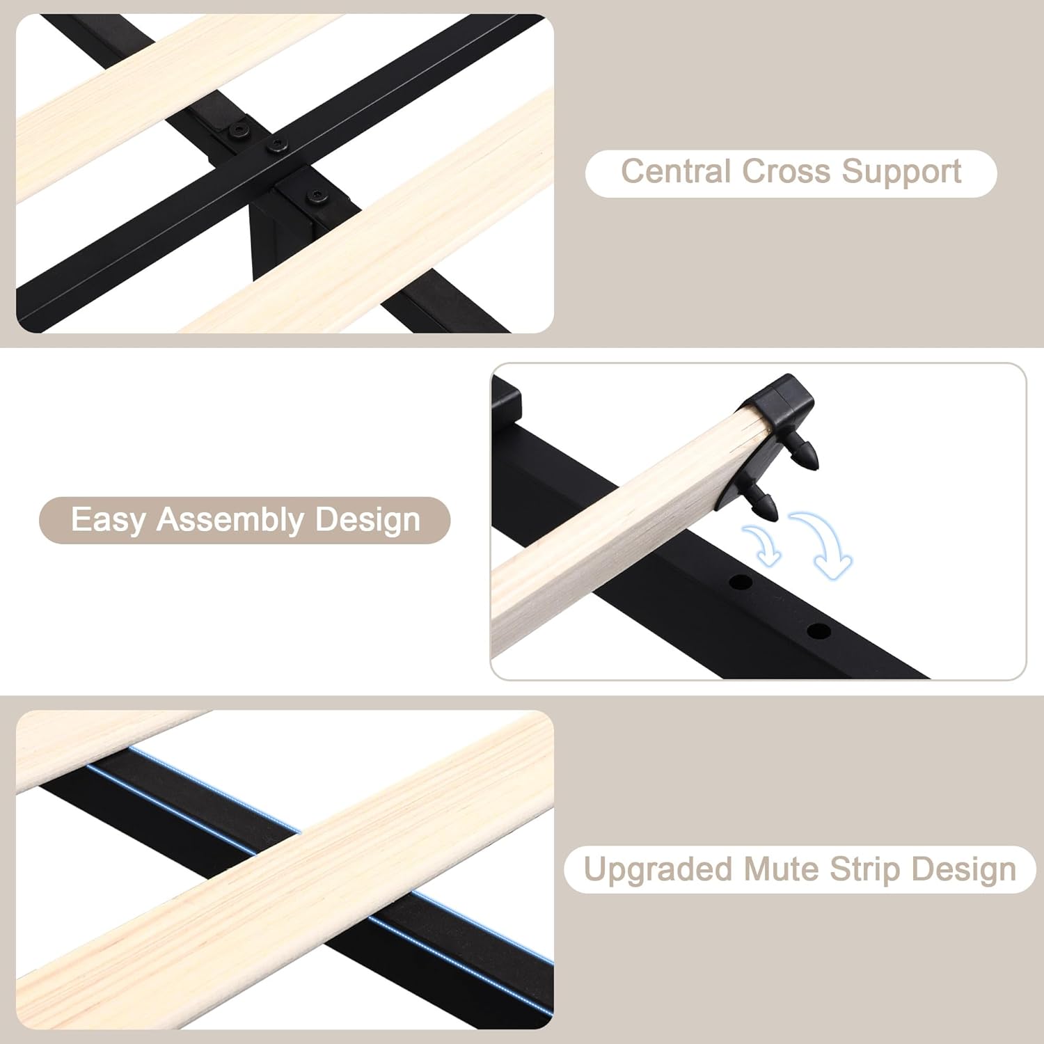 • No-Sag Low-Profile Frame: Heavy-duty metal frame paired with 12 solid wood slats tightly arranged, evenly stressed, , to avoid the mattress sinking, supporting for up to 1000 Lbs. Its low-profile design ensures safety for children and keeps pets from hiding underneath