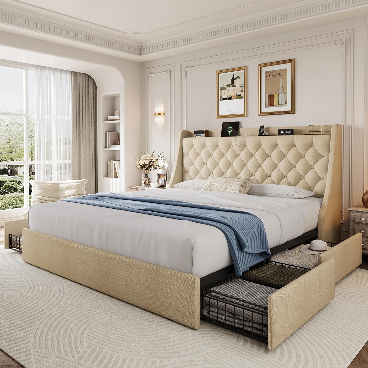 Queen Size Upholstered Platform Bed Frame with 4 Storage Drawers and Charging Station, Linen Button Tufted Wingback Headboard, Sturdy Wooden Support Slats, No Box Spring Needed, Black