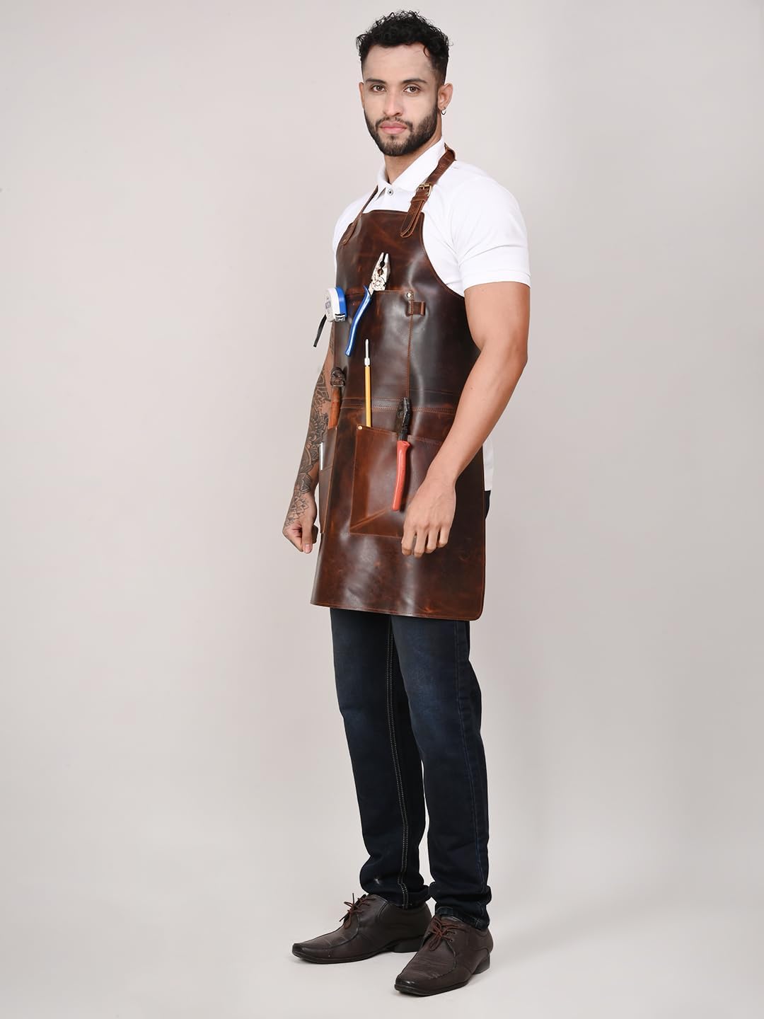 Rabada introducing Heavy Duty Cow Leather Apron – a versatile apron with durable work wear essential. Designed as a perfect woodworker's apron and can be used for all types of carpenters and Industrial wood workplaces. A welder Apron is made of fine leather and has high resistance to heat and flame. A perfect leather apron is a perfect BBQ enthusiast apron, Its sturdy leather and resistance to heat and flame make it the best apron for blacksmiths, and various industrial settings. Crafted from high-quality cow leather, this apron offers superior protection against heat and flames, ensuring safety in demanding work environments. Whether you're working in a workshop, handling welding tasks, firing up the grill, or managing industrial operations, our Heavy Duty Cow Leather Apron is your reliable companion. Invest in quality, comfort, and safety for your work wear needs.