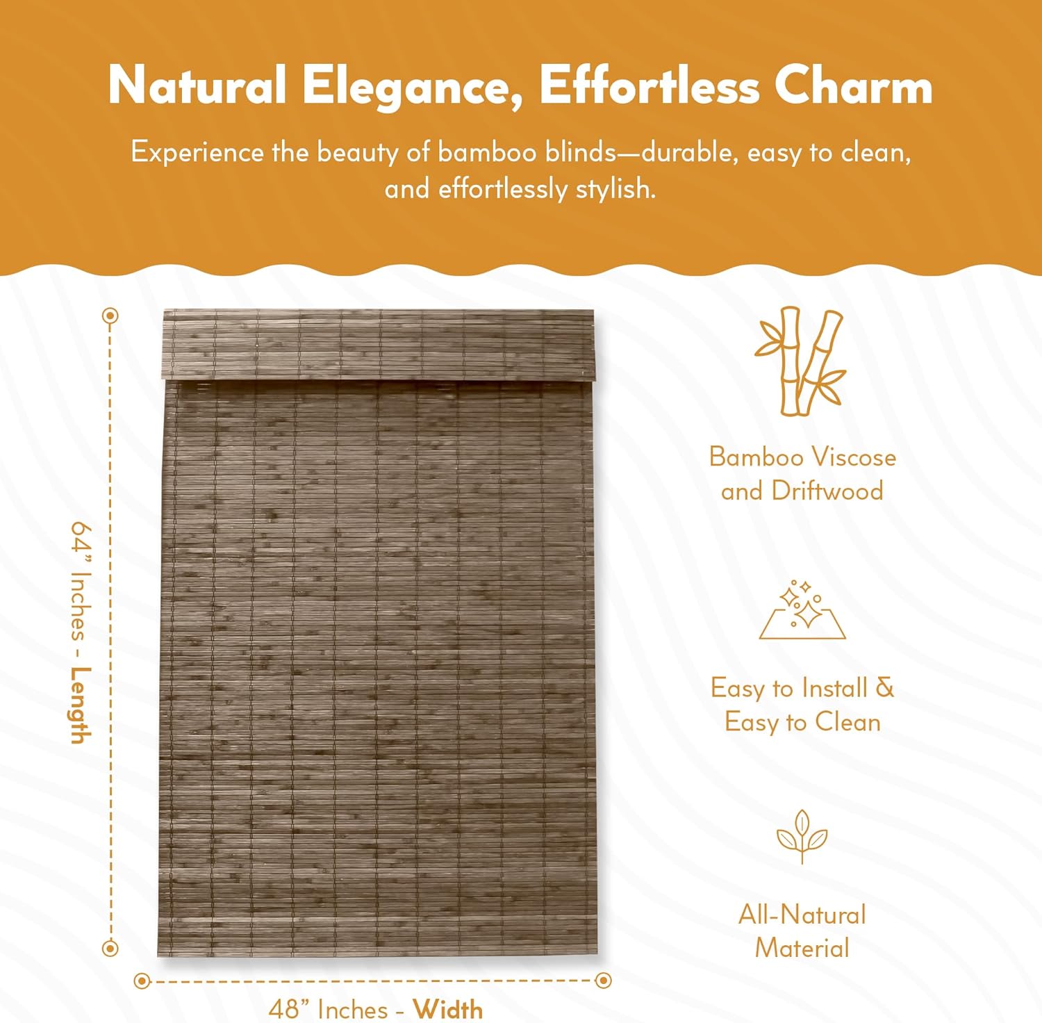 Relax the look of any room with the casual and comforting cordless Driftwood Dockside flatstick bamboo roman shade. semi-private textured natural shades (also called natural shades, bamboo shades, or woven woods) stylishly filter light and protect your furniture from fading. The rich wood tones of bamboo blinds are complimentary to jute and sisal rugs as well as many hardwood floors and furniture finishes. 100Percent bamboo viscose blinds are textured window blinds that are available in many different colors and styles. They are popular window treatments for coastal and beach properties, lakeside or country cottages, and traditional or Metropolitan homes. For additional privacy or neutral backing, you can attach a fabric privacy liner to the back side of natural shades. Another option for additional privacy is to outside mount natural shades, then inside mount an inexpensive white black out roller blind. Imported