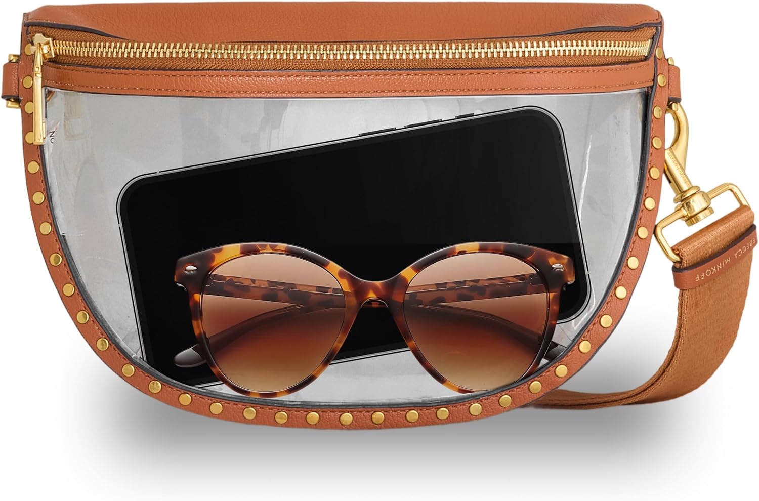 The Rebecca Minkoff Clear Stadium Approved Darren Sling Bag blends compliance with confidence, turning stadium regulations into a style statement. Crafted from crystal-clear PVC and finished with sleek black trim, it features the brand’s signature dog clip turn-lock closure, sleek rectangular silhouette, and an adjustable removable cross body strap for hands-free ease. Designed to meet concert and stadium event clear bag requirements, the spacious single storage compartment easily fits your phone, wallet, small water bottle, sunglasses, and other game-day essentials while keeping them secure and visible. Ideal for concerts, sporting events, and festivals, our versatile handbags transition seamlessly from stadium seats to street style, proving that practicality can still be polished, edgy, and unmistakably Rebecca Minkoff.