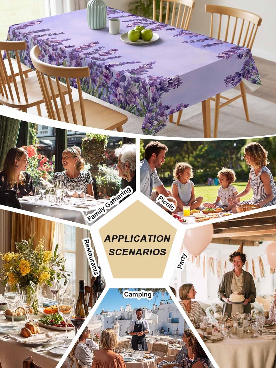 Are you looking for baby shower tablecloth/banquet tablecloth/baptism tablecloth/BBQ tablecloth/birthday party tablecloth/picnic tablecloth/camping tablecloth/farmhouse tablecloth/outdoor tablecloth/indoor tablecloth/fiesta tablecloth/summer tablecloth/rustic tablecloth/decorative tablecloth?Please look at our outstanding tablecloth, which help you solve daily spill, stain, scratch problems, but also add some extra bonus.** Excellent StructureOur table cloth consists of 3 layers:--The top layer is a waterproof, stainproof, oilproof, spillproof polyester coating;--The middle layer is a exquisite high definition pattern;--The last layer is a soft cotton linen lining.** Exquisite WorkmanshipThis tablecloth is made by skilled artisans with fine stitching. The hem is designed with folded border and fine stitching to ensure elegant looking and no loose threads.** Stain & Water & Spill ProofThis smooth and durable tablecloth is made of premium polyester fabric with stain-proof, water-proof and spill-proof treatment. All liquids bead up for easy cleaning, no leaks, can use for a long time!HOW TO CHOOSE A SUITABLE TABLECLOTH?** Tablecloth Length=Table Length + Drop Length x 2;** Tablecloth Width: Table Width + Drop Length x 2.** 54x54 Square Tablecloth Fit for 2-4 persons(2-4 FT Tablecloth)** 60x60 Square Tablecloth Fit for 2-6 persons(2-6 FT Tablecloth)** 52x72 Rectangular Tablecloth Fit for 2-4 persons(2-4 FT Tablecloth)** 52x108 Rectangular Tablecloth Fit for 4-6 persons(4-6 FT Tablecloth)** 60x84 Rectangular Tablecloth Fit for 4-6 persons(4-6 FT Tablecloth)** 60x102 Rectangular Tablecloth Fit for 6-8 persons(6-8 FT Tablecloth)** 60x120 Rectangular Tablecloth Fit for 6-10 persons(6-10 FT Tablecloth)Upon arrival there are folds, which is normal. Hang it up, iron in low temperature, or threw them all in the dryer! The wrinkles will disappeared.