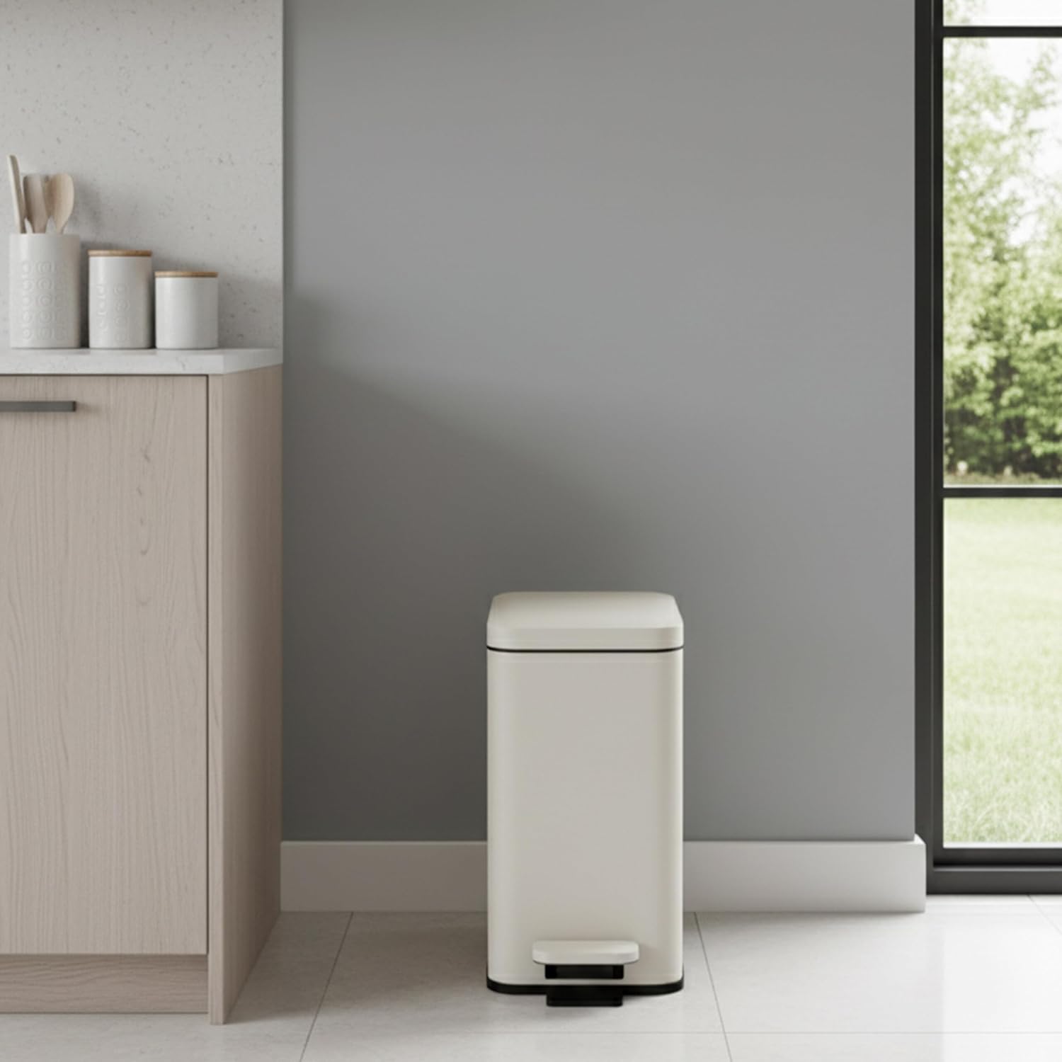 Keep your kitchen and bathroom clean with this modern trash can in a slim design. Thanks to the pedal, the lid can be opened hygienically and hands-free The integrated soft-close mechanism closes the lid of the toilet bin quietly and in a controlled manner. The removable inner bucket makes emptying easier. Ideal for hygiene and kitchen waste, the pedal bin offers a practical and clean solution in everyday life. The narrow bin is ideal for niches in small rooms, such as the guest toilet. Bin in detail. Dimensions H x W x D: approx. 36 x 16 x 30 cm. Volume: approx. 10 litres. Weight: approx. 1.5 kg. Material: iron, plastic. In various colours. Hygienic bucket with soft-close mechanism. Bin for disposal of waste in the bathroom or kitchen. Slim cosmetic bin for small bathrooms. Pedal bin for hands-free opening and closing. Lid can remain open for longer use. Soft-close mechanism prevents abrupt slamming. Removable inner bucket makes emptying easier. undetetetetetetRubbish bin with matte finish sets decorative accents. Box contents: 1 x rubbish bin. Decorative items are not included
