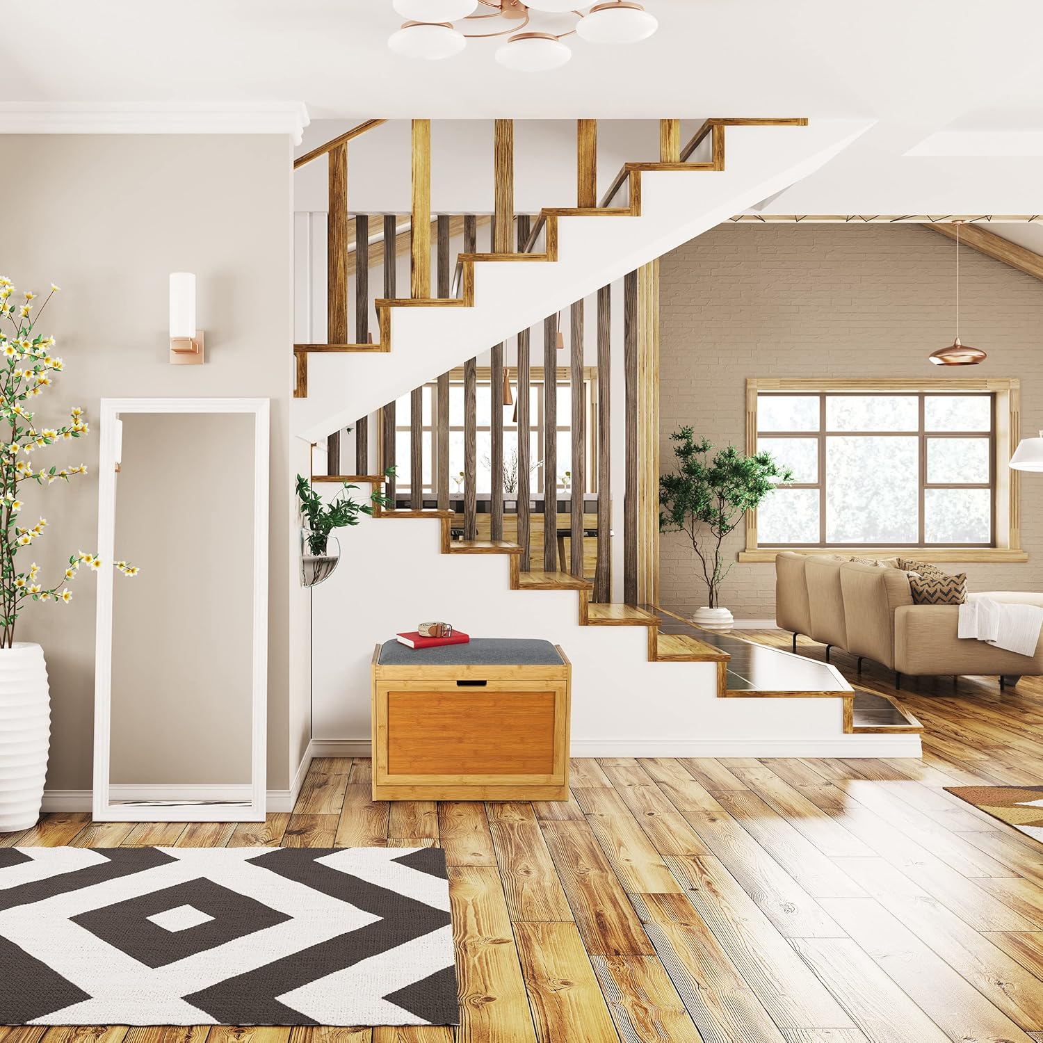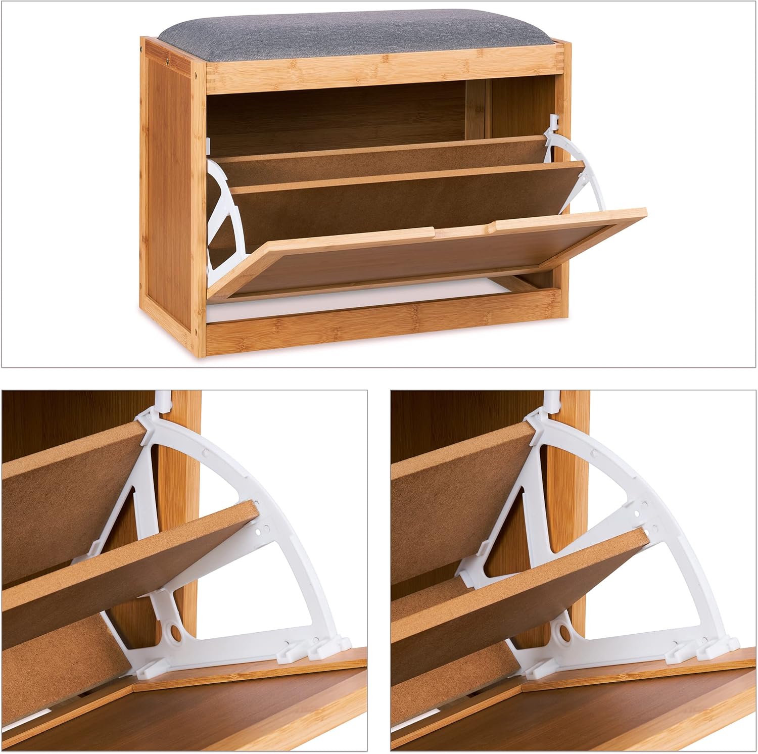 Sit on the upholstered seat in a stylish linen look and take off your shoes in comfort. You can then store them in the shoe drawer. The shoe box has 2 adjustable shelves, so there is room for taller shoes. In total, you can store 6 pairs of shoes in the hall bench. The bamboo construction makes the shoe rack very sturdy and it will be a highlight in the entrance area of your home.Shoe bench in detail- Overall dimensions H x W x D: approx. 49 x 63 x 29.5 cm- Seat height: approx. 45 cm- Dimensions shoe rack W x D: approx. 57.5 x 31 cm- Height of compartments adjustable: 10.5 / 11 cm and 12 / 9.5 cm- Weight: approx. 7.5 kg - Load capacity: approx. 80 kg- Material: Bamboo, polyester, foam- Colour: Natural, greyBamboo shoe chest with grey seat- Material mix of bamboo with grey linen-look fabric- Recessed handle for easy opening of the shoe chest- Sufficient space for up to 6 pairs of shoes- Adjustable board for different heights of the shelves- Keeps the entrance area tidy- Modern shoe cupboard for hallway and hallway- Comfortable seat for exhausted legsIncluded in delivery- 1x shoe bench to be assembled- With instructions and assembly material- Decorative items are not included