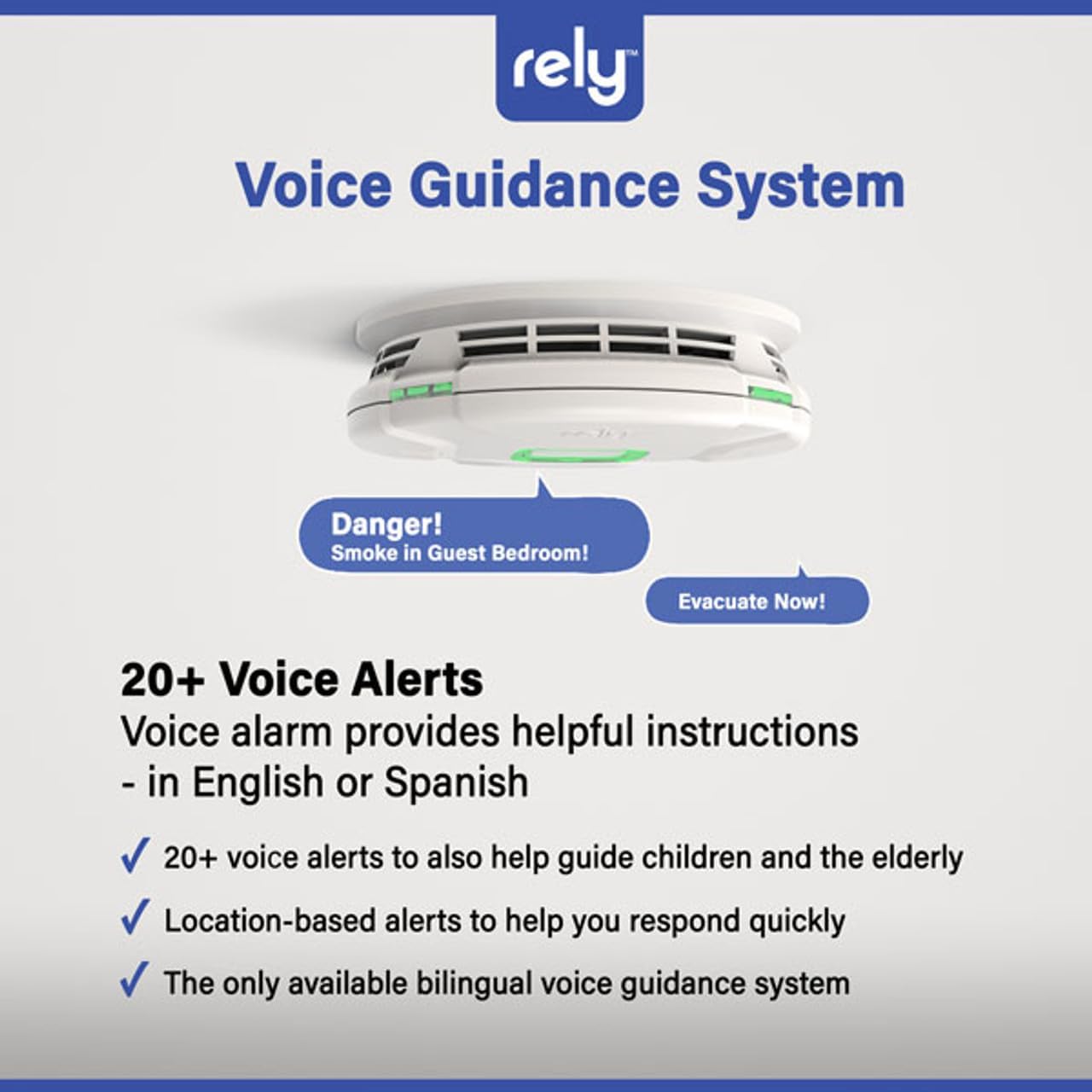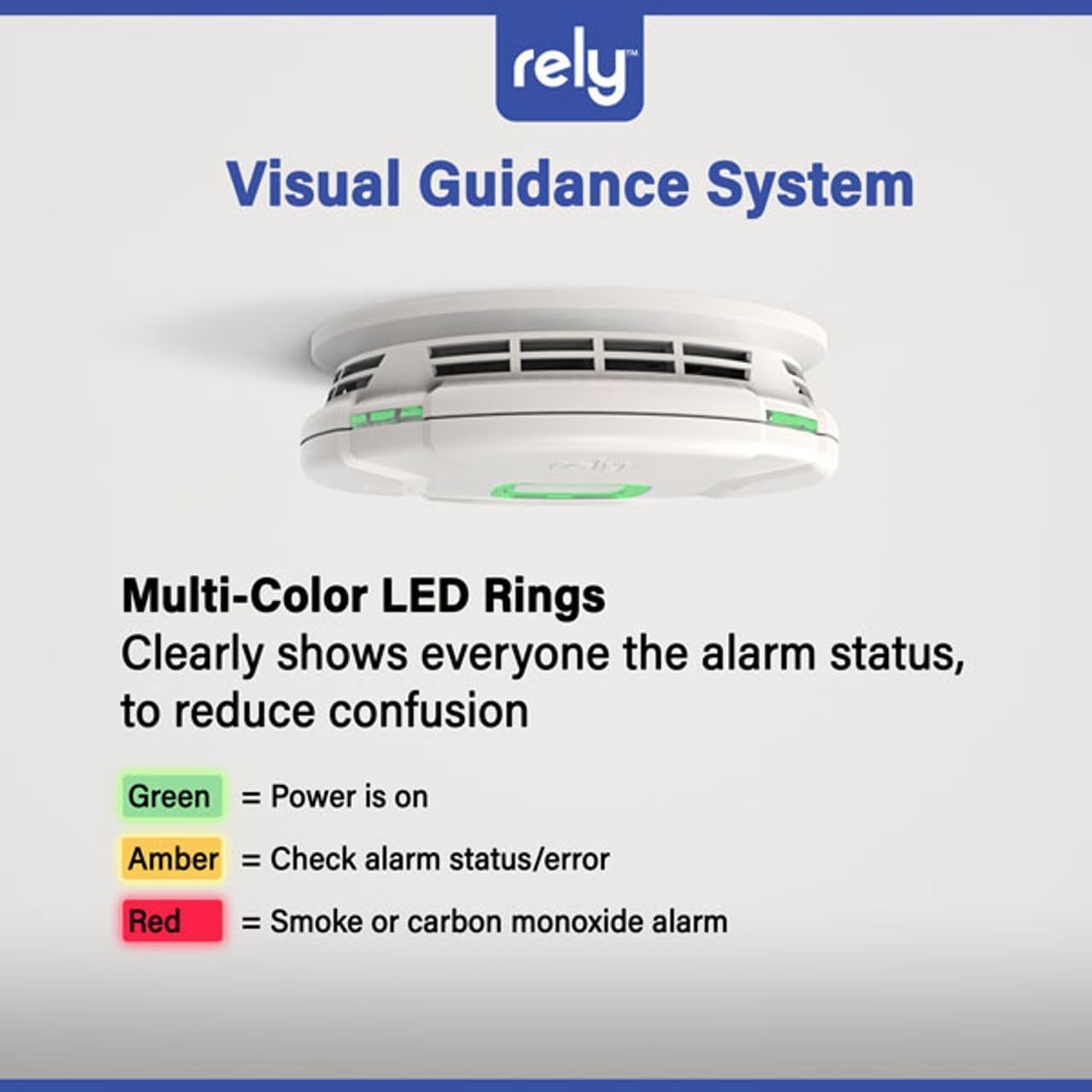 Protect your home with clarity, confidence, and fewer false alarms. The Rely 7400 Combination Smoke & Carbon Monoxide Alarm features the RealAlerts Precision Warning System—an advanced solution that provides more than just a beep. With over 20 distinct voice alerts and color-changing LED rings, RealAlerts helps you immediately understand what kind of danger is present—smoke or carbon monoxide—and what to do next. It’s also the only alarm that lets you choose between English or Spanish voice alerts, so every household can get the information they need in the language they trust. Unlike conventional alarms that often alarm from steam or cooking fumes, the Rely 7400 uses smart sensing technology to better distinguish between real fire danger and everyday events. That means fewer unwanted alarms—and faster warnings when it really counts. This model meets the latest UL standards for both smoke (UL 217 9th Edition) and carbon monoxide (UL 2034), ensuring up-to-date protection across fire and CO threats. Designed for new construction or replacement of existing hardwired units, the Rely 7400 connects quickly using a universal mounting bracket and included wiring harness. The 10-year sealed backup battery provides added protection during power outages—no replacements needed. With Rely, detection and communication work together—because safety isn’t just about sensing danger, it’s about helping people respond with confidence.