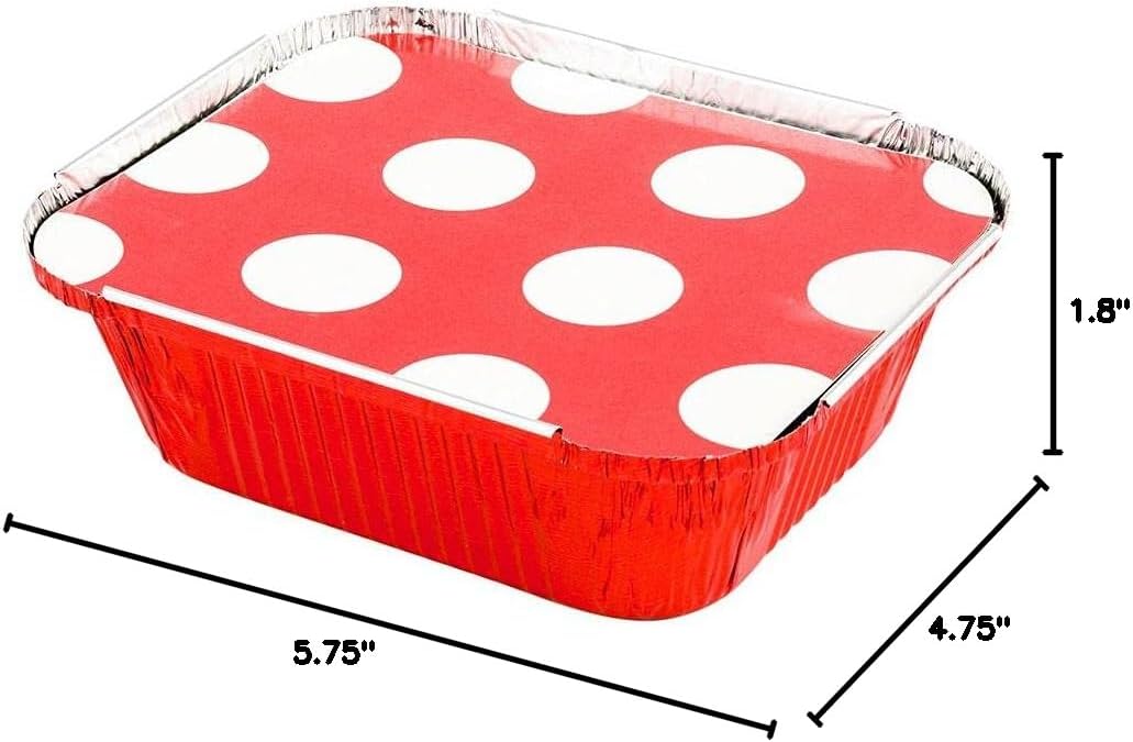 Our Restaurantware 12-Ounce Disposable Takeout Containers combine functionality with aesthetic appeal, perfect for enhancing your meal delivery service. Each container is crafted from durable aluminum and features a striking red color complemented by polka dot paper lids. The robust design ensures these containers maintain their structure during delivery, while the silver foil lining helps keep hot foods at the desired temperature. Designed to be oven-ready and freezable, they are versatile for various food service needs. The disposable nature of these containers allows for effortless cleanup, making them an excellent choice for restaurants, catering, and special events. This pack contains 50 rectangle food containers, each measuring 5.8 inches long, 4.8 inches wide, and 1.8 inches tall, capable of holding up to 12 ounces.