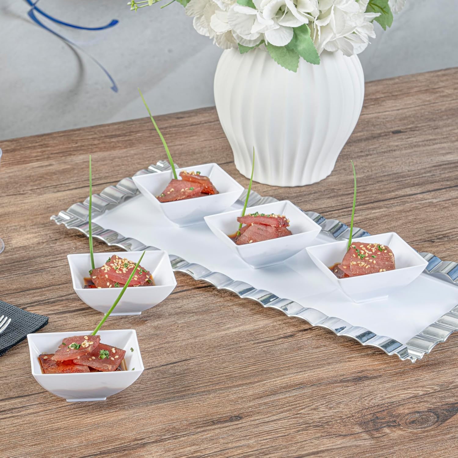 Enhance the presentation of your bite-sized appetizers with our Mini Serve 3-ounce Rectangle White Plastic Small Architetto Bowls. Crafted from premium plastic, these candy bowls feature a resilient yet lightweight build to endure your demanding catering requirements. These plastic bowls are versatile and suited for serving a broad range of food types, such as cold, wet, or dry food, at your parties. The stylish rectangular form and raised edges of these white bowls create a sleek and modern look, augmenting the overall charm of your table setting. These serving bowls have a capacity of 3 ounces and provide sufficient space for displaying miniature portions and amuse-bouches. For your convenience, these snack bowls are designed to be disposable, making cleanup effortless. These rectangle bowls measure 3.2 inches in length by 2.3 inches in width by 1.3 inches in height and can hold up to 3 ounces. Shipped in a 100 count box.