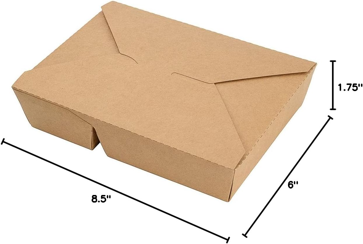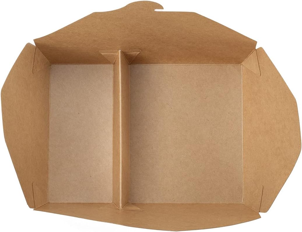 Pack up family-size orders for customers using our Bio Tek 50-ounce Rectangle Kraft Paper #5 Bio Box Take Out Containers. Featuring two compartments, these carry out containers allow you to conveniently pack entrees and sides together for guests all in the same container. These disposable lunch boxes are grease-resistant to stop oils from leaking through and creating messes. Designed with a convenient tab-lock closure and foldable flaps, these take out boxes securely lock in place to ensure meals stay intact during transport. Made from high-quality kraft paper, these take out containers are heat-resistant, making them ideal for serving hot and cold foods to go. These take out containers hold up to 50 ounces of your customer's desired meals. With a natural kraft finish, these disposable lunch boxes add a rustic touch to the to-go packaging at your catering service or restaurant. For an eco-friendly and quick cleanup, these take out containers are conveniently recyclable. These take out boxes measure 8.5 inches in length by 6 inches in width and 1.75 inches in height. Sold in a 200 count box.