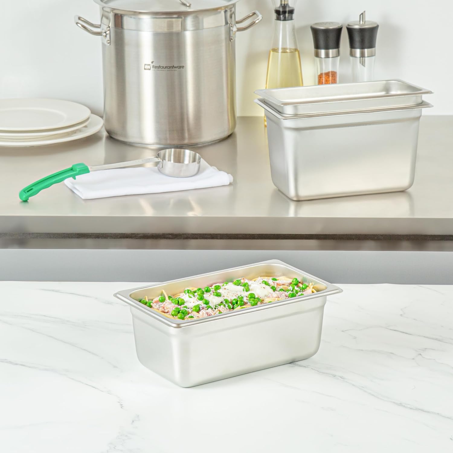 Reinvent your catering offerings with our Kitchen Tek Stainless Steel 1/4 Size Steam Table Pans. Designed with anti-jam stacking lugs, these steam pans ensure smooth separation and no-hassle handling to boost your kitchen's productivity. Crafted with 24 gauge stainless steel, these steam table pans exhibit exceptional resilience against the daily demands of commercial kitchens. These hotel pans can be paired with its compatible lids (SKUs: RWT1613S and RWT1621S) to protect your culinary creations. Conforming to NSF standards, these stainless steel pans meet the requirements of the food industry. The 4-inch depth of these buffet pans accommodates a variety of servings, from petite pastries to fresh fruit assortments or appetizers. With their durable construction, these metal buffet pans ensure longevity, making them an ideal choice for serving a range of hot and cold dishes. Engineered for oven use, these food steam table pans can withstand temperatures up to 1600F. These stainless steel catering pans are freezable, enabling convenient storage of prepared meals. For easy post-service cleanup, these metal pans are compatible with commercial dishwashers. These catering pans measure 10.4 inches in length by 6.4 inches in width by 4 inches in depth. Sold in a 12 count box. Lids are available and sold separately.