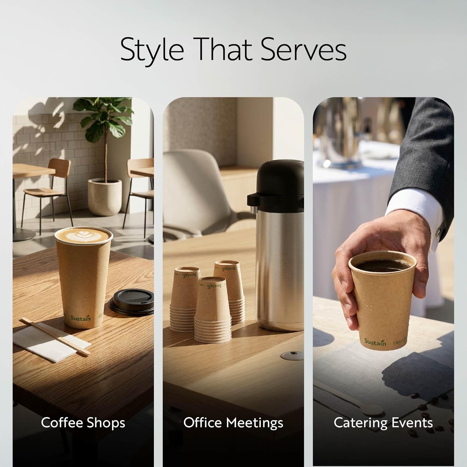 Allow your patrons to savor a steaming cup of coffee or tea with ease using our Sustain 4-ounce Kraft Paper Coffee Cups. These sustainable cups come with interiors coated using PLA plastic, which ensures secure moistureproof attributes to avoid unwanted leaks. Commercially compostable, these BPI-certified cups for warm beverages aid in managing your establishment's carbon emissions efficiently. The sturdy construction of these single-wall coffee cups is achieved by using thick paper to create a durable structure with a reinforced rim. These paper cups can endure temperatures as high as 212F, making them an excellent choice for either hot or chilly drinks. Engraved with an "I AM COMPOSTABLE" symbol, these single wall cups inspire your patrons to participate in sustainable waste disposal. The moderately tapered contour of these compostable paper hot cups not only ensures a snug grip but also permits easy stacking. To enhance your beverage experiences, pair these coffee cups with our array of coordinating lids. These paper cups measure 2.4 inches in diameter by 2.4 inches tall, which makes them an apt choice for serving espresso shots or sampling drinks at your cafe, eating joint, or kiosk. Shipped in a 1,000 count box. Lids are available and sold separately.