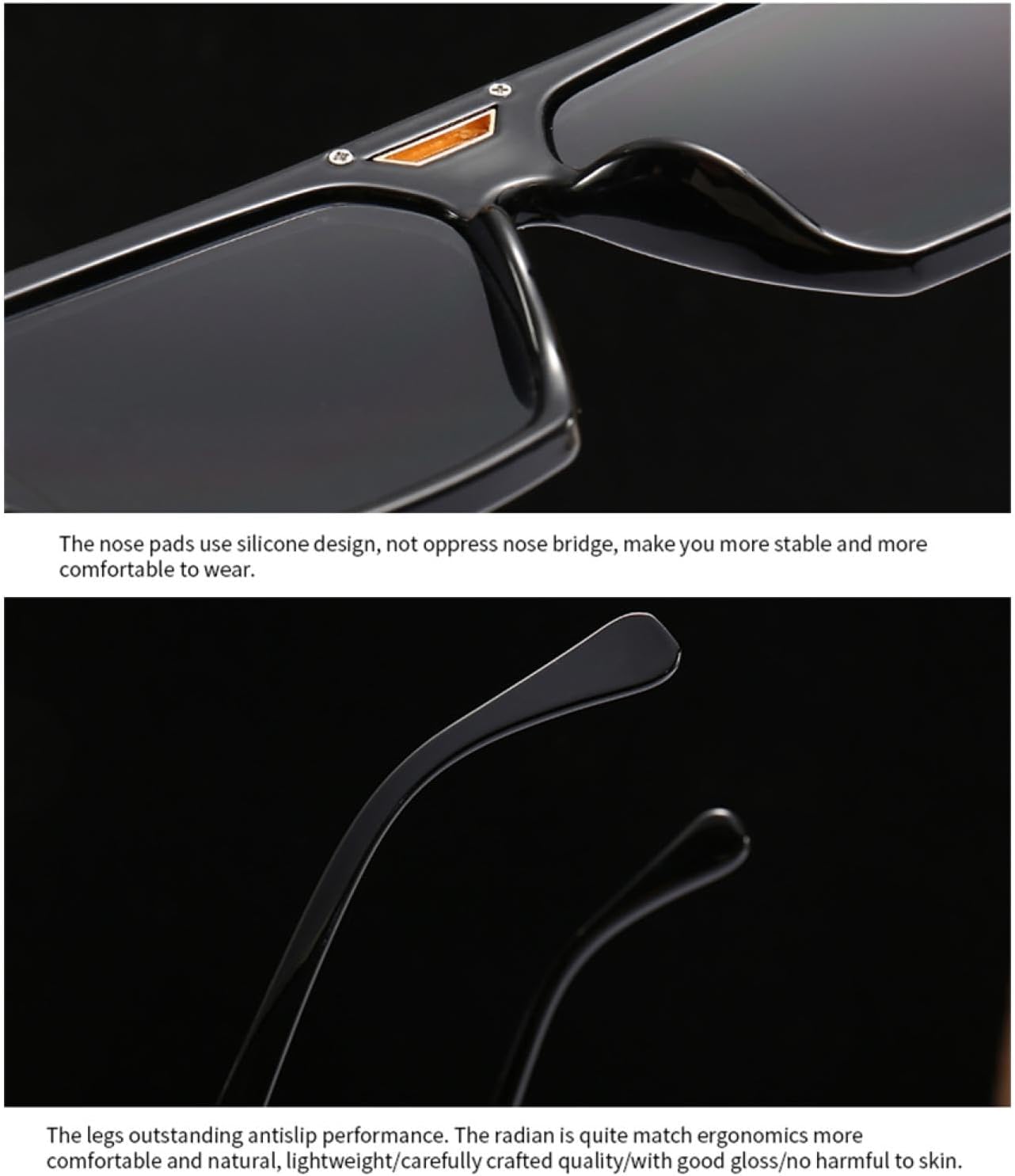 "Element type:Trendy and fashionableApplicable Scenarios:OutdoorProduct Type:Fashion SunglassesLenses Material:PlasticDepartment Name:ADULTGender:MENFrame Material:PlasticLenses Attribute:UV400Item Type:EYEWEAREyewear Type:SunglassesQUALITY MATERIALS:The frame is made of quality materials, durable, exquisite appearance, good texture, can enhance the overall image of the wearer. The temples and nose pads are designed with non-slip silicone, not easy to fall off.Design: Premium PC material makes the frame skin-friendly and ultralight. The integral nose pads contact with the surface of the skin, are not easy to slide, and have no pressure. The advantage is the relatively stable shape, by the external force is not easy to deform. Hope these bring you a different wearing feeling!Protection:Experience clear vision with our sunglasses! Users rave about their effectiveness in reducing glare, enhancing clarity for outdoor activities . With effective eye protection, these sunglasses ensure you enjoy clear and protected vision in bright conditions.SUITABLE FOR VARIOUS ACTIVITIES:This sunglasses is suitable for a variety of outdoor activities, such as running, cycling, climbing, skiing, and golfing. While maintaining fashion, it can also protect your eyes from the threat of strong light and wind and sand, providing you with a clear vision.After-Sales Service:After receiving sunglasses,please contact us even if you have any product problems,we will solve the problem for you at the first time."