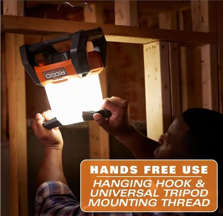 The RIDGID R86903 18V 360° LED Area Light delivers 2,000 lumens from clear white LEDs to illuminate your area. RIDGID Clear White LEDs consistently provide clear white light providing users visibility of fine details and accurate colors. The area light features three brightness settings with three directional modes with up to 18 hours of runtime on low setting (using an AC840060 18V 6.0Ah MAX Output Battery). Built for the everyday jobsite conditions, this durable light is IP54 rated water and dust resistant. For optimized user control and versatility, this tool can provide 360°, 180° (front only), or 180° (rear only) illumination. For hands free operation, the area light can be hung from its integrated hanging hook or mounted on universal tripod stands (1/4 in.-20 thread). The USB-A and USB-C charging ports allow you to charge your small mobile devices anywhere you go. As always, this RIDGID 18V 360° LED Area Light is 100% compatible with all RIDGID 18V batteries. This tool is backed by the Industry’s Best Lifetime Service Agreement, simply register within 90 days of purchase for FREE Parts, FREE Service, FOR LIFE. The R86903 includes the 360° LED Area Light. Batteries and charger sold separately.