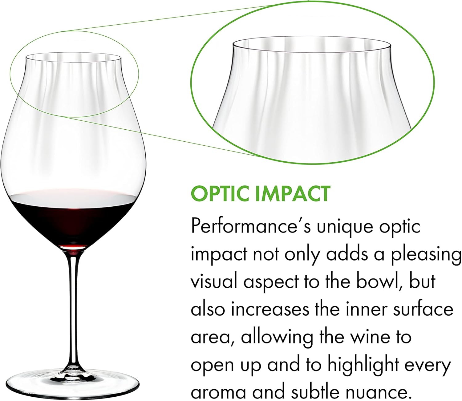 THE ULTIMATE LOUDSPEAKER FOR FINE WINE With three generations of experience in creating functional, grape varietal specific glassware, RIEDEL Performance is the result of 10th and 11th generations Georg and Maximilian Riedel's drive to continually improve on what has come before. This technologically advanced collection is the first RIEDEL series to feature bowls with a light optic impact. Detailed research by the Riedel family, aimed at improving the organoleptic wine experience, revealed that increasing the inner surface area of the glass had a positive impact on the perception of the bouquet and flavour of the wine. This was achieved through a unique optical effect, which not only adds a pleasing visual aspect to the bowl, but also expands the surface area, allowing the wine to open up and to fully show every aroma and subtle nuance. Consisting of lightweight, durable and dishwasher-safe shapes, RIEDEL Performance glasses are executed by machine in sparkling crystal glass. With fine stems and large stable bases, the range also includes new bowl shapes for Cabernet, Chardonnay and Riesling that, when combined with the optic effect, deliver ultimate wine enjoyment. RIEDEL Performance is a must-have glass collection for all wine lovers. RIEDEL Performance is produced by machine in crystal glass. All RIEDEL Performance glasses are dishwasher safe.