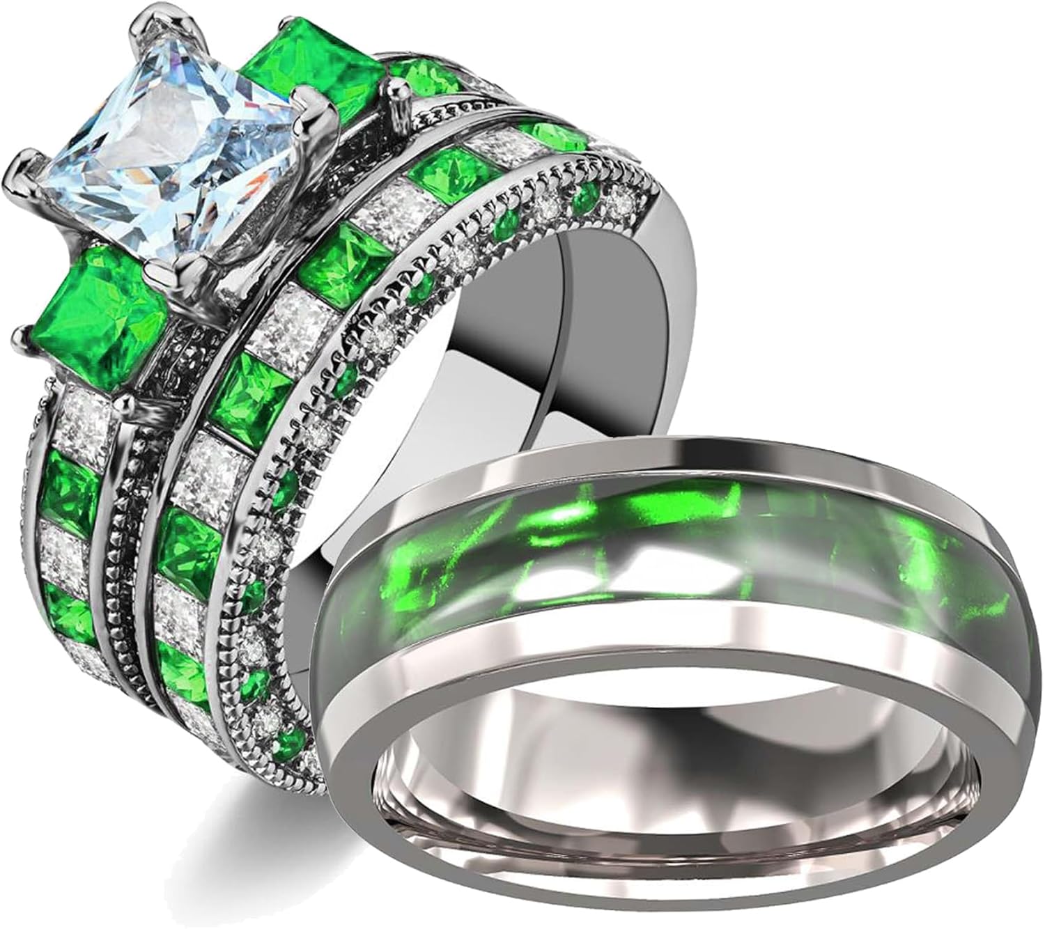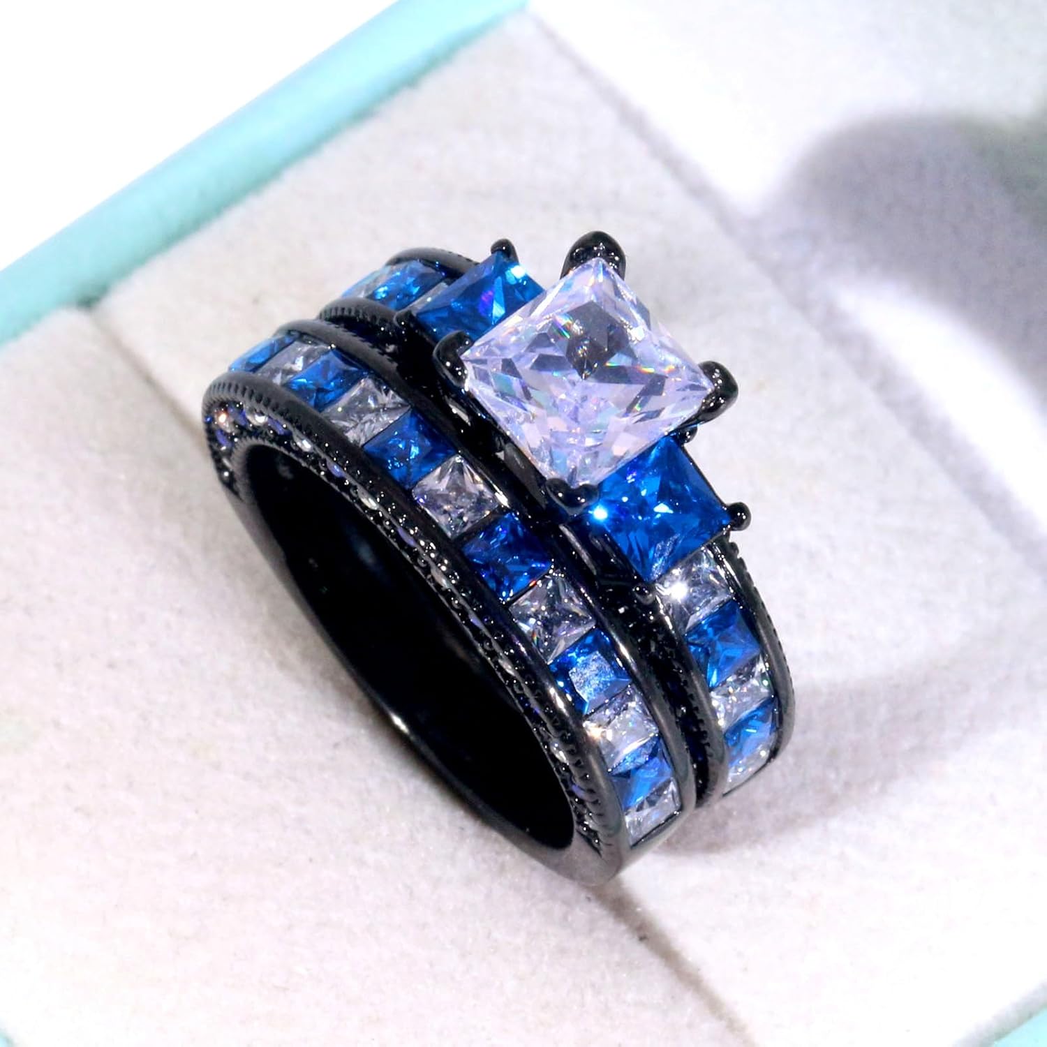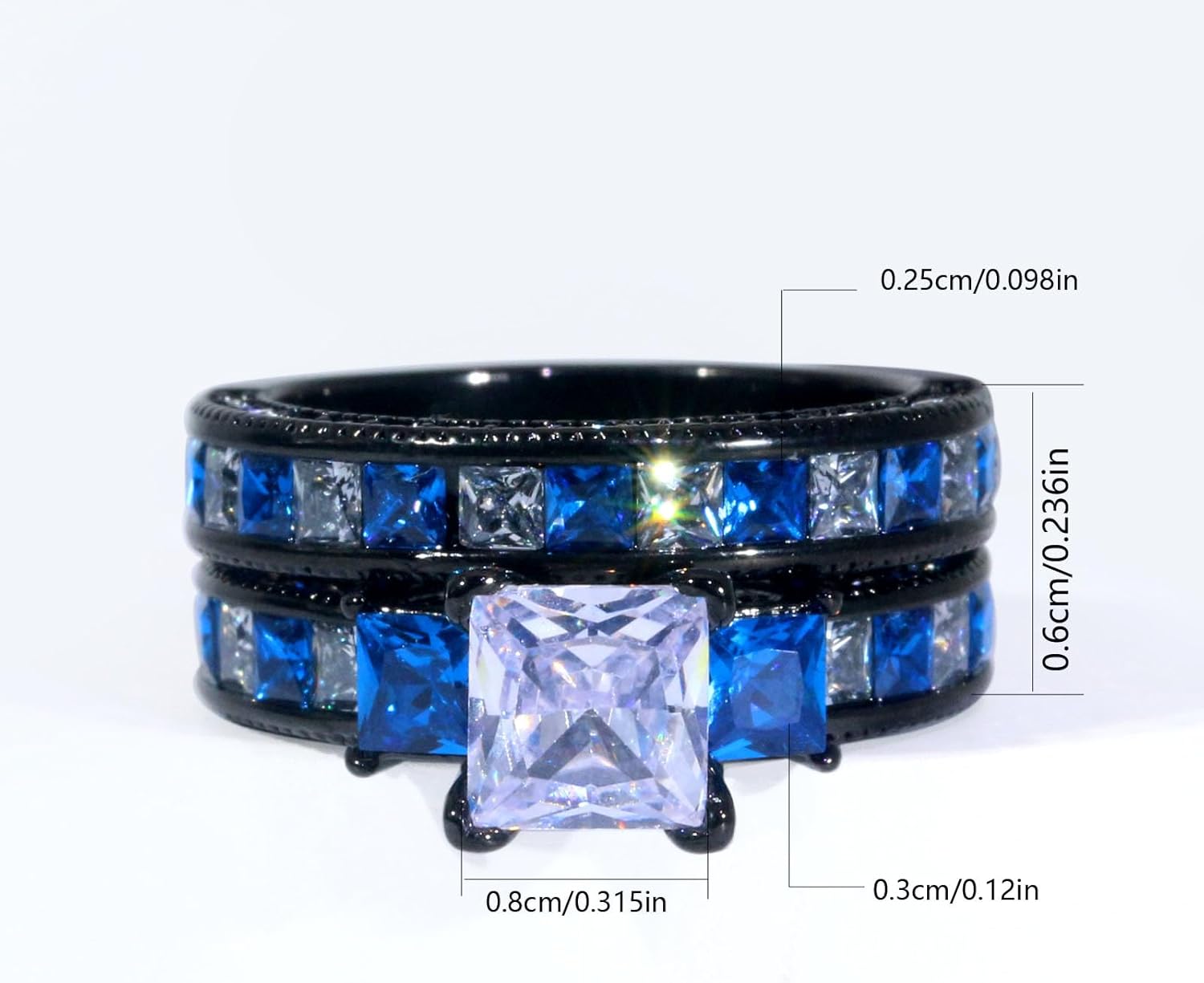 Womens ring is black plated three stone princess cut 1.5ct 8*8mm aaa cz mainstone 2pcs wedding ring sets,stamp:10kt.Mens ring is black and blue plated titanium wedding bands,8mm width,2.5mm thick.stamp:titanium. RingHeart ring is not only beautiful, but also more safety and functionality.Its color is permanent,it is not easy to be oxidized,it is lead-free,nickel-free,safe to wear,allergy is eliminated.Material:It does not contain nickel or lead. It conforms to European and American standards,and is more comfortable to wear and not allergic.Inlay:Select qualified stone inlays,check the finished products one by one, and do anti-falling stone test,strictly control the problem of stone,rotten stone and dumb stone.Plating:5 layers of plating protection,color retention for more than 1 year. 1.The ring photos capture all the physical.