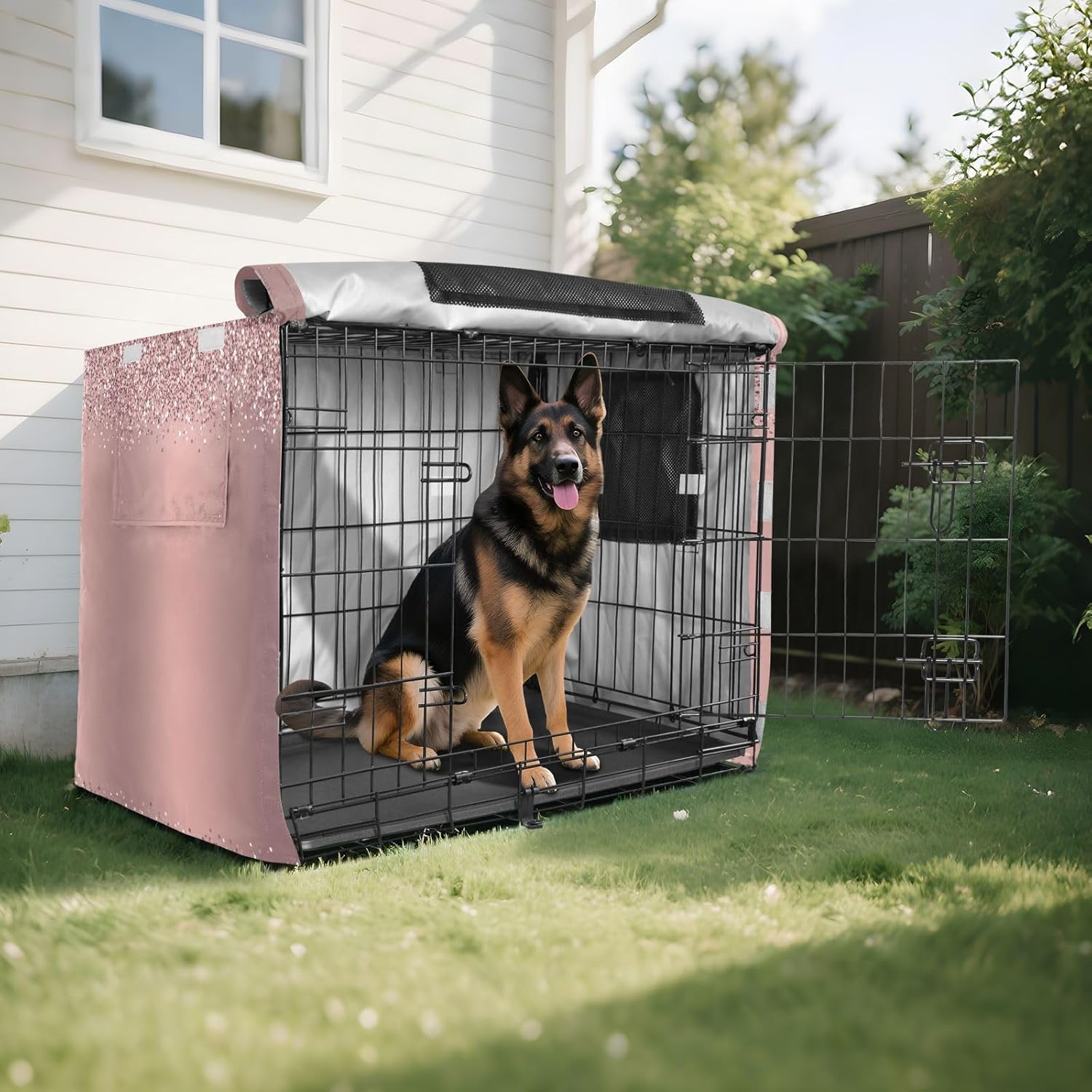 Protection – Made from 600D silver-coated oxford fabric, this pet crate cover provides reliable protection against weather conditions, including wind and rain. It prevents your dog from scratching the crate and blocks harmful UV rays.Easy Installation – This foldable crate cover features a user-friendly fastening system, allowing for quick installation without tools. It securely attaches to your dog crate, ensuring it stays in place for continuous protection.Effective Ventilation – Mesh windows on every side of the crate cover allow for steady airflow, keeping your dog comfortable and well-ventilated while inside. This design ensures your pet has a cool and breathable environment.Secure Fit – Equipped with four tie-down straps, the cover stays firmly in place, preventing it from shifting or being blown away. This added stability makes it suitable for outdoor use even in windy conditions.Ideal for Multiple Uses – This versatile dog kennel cover is Suitable for both indoor and travel use. Whether you’re at home, on a road trip, or camping, it offers a practical solution for protecting your pet’s crate.