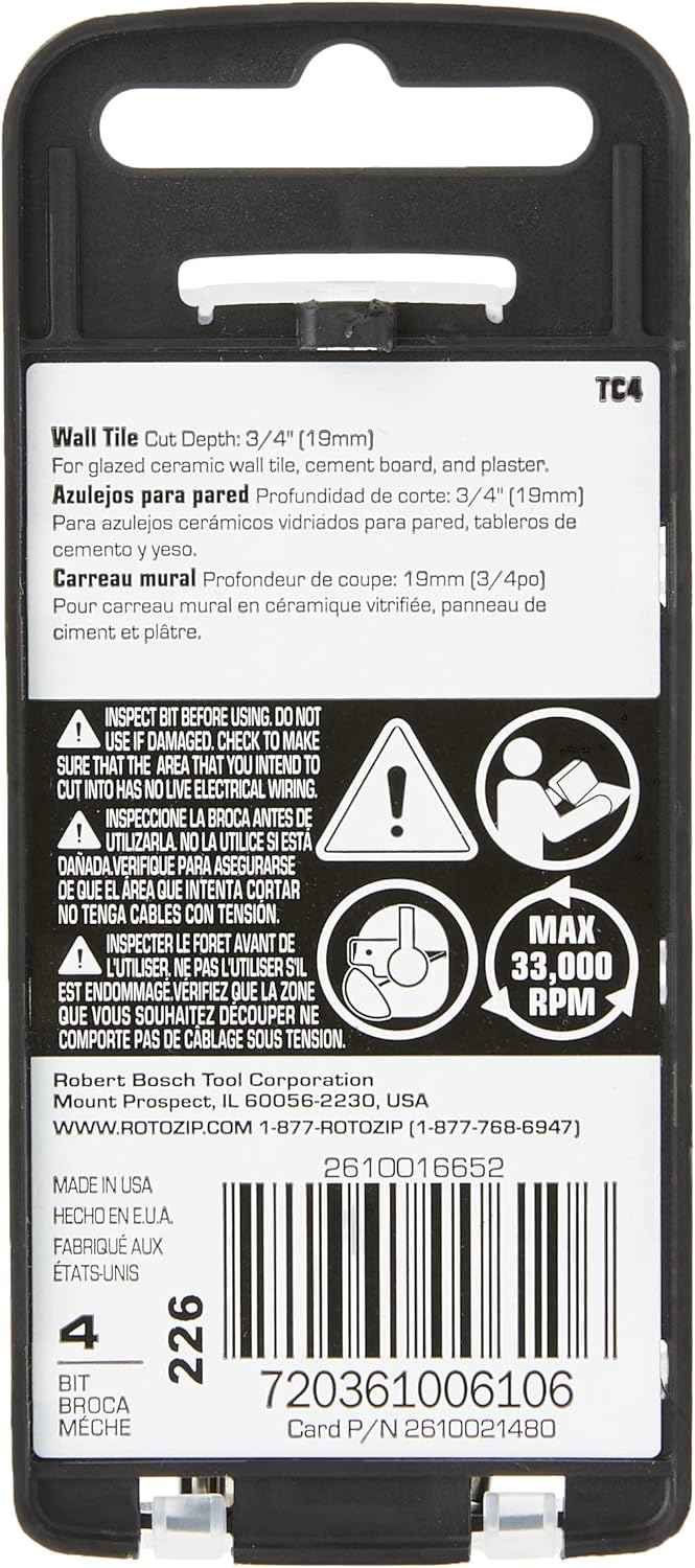The RotoZip TC4 Carbide ZipBit is specially designed for use with RotoZip tools on ceramic wall tile (only soft tile with glazing), cement board, stucco and plaster. The TC4 allows you to cut material up to 1-Inch thick. Zip Bits bits are made of steel and feature a 1/8-Inch shank. This pack comes with 4-bits. For use with RotoZip Spiral Saw power tools.