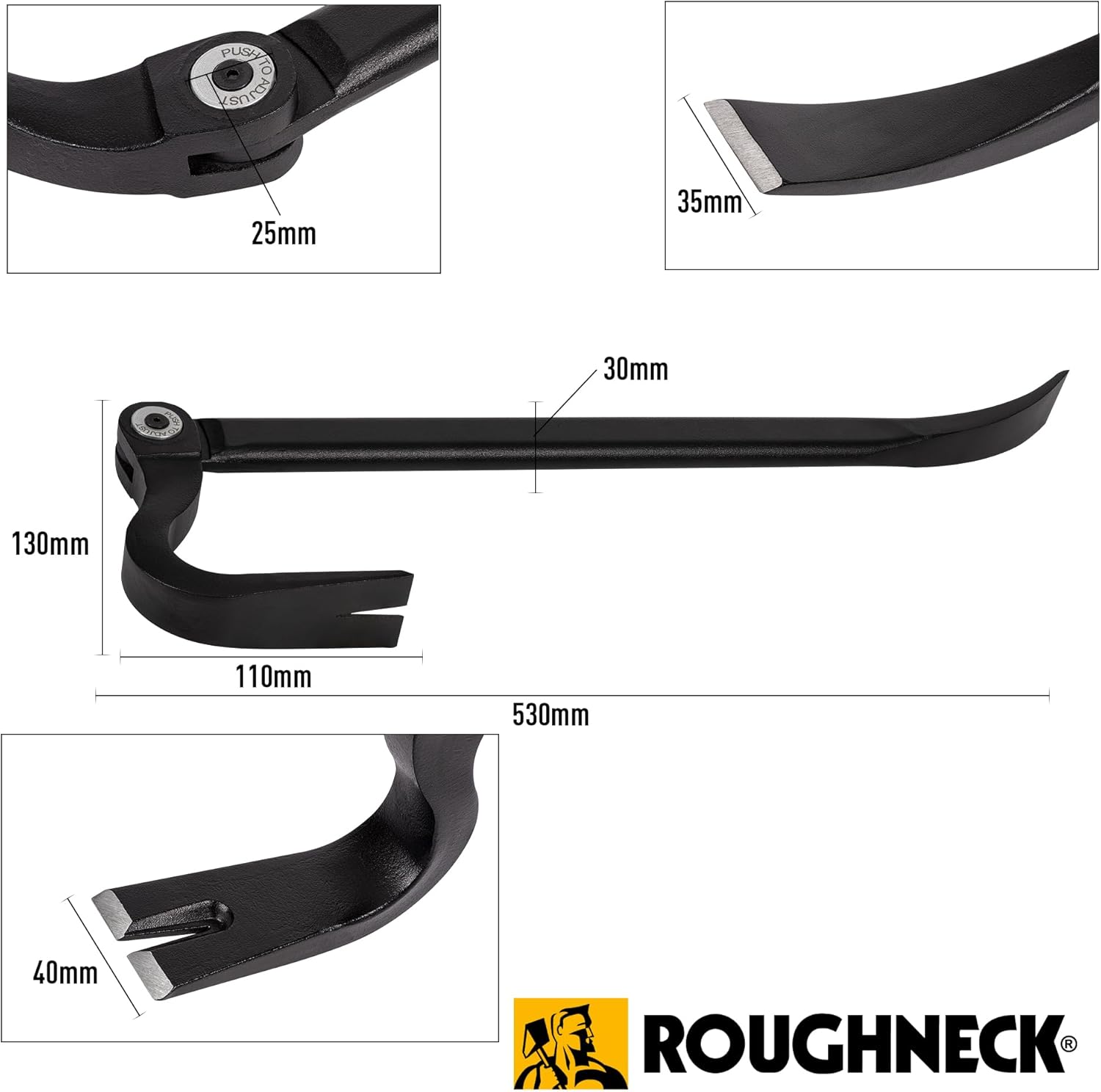 Roughneck® Adjustable Gorilla Bars - The shape makes the difference. The push button adjustable claw locks into 9 differet positions, enabling the optimal angle for maximum leverage at all times. Offering up to 50% greater leverage power, the legendary Roughneck® Gorilla Bar is arguably the finest wrecking bar on the market. Drop forged and heat treated for exceptional strength and durability, with wide low profile jaws for easier penetration and more effective prying. Powder coated finish and polished tips offer greater resistance to corrosion. With bevelled nail remover for prying embedded nails. • 9 position adjustable claw • +50% leverage power • Low profile • Wide jaws • Polished tips • Nail remover • Heat treated • Drop forged • Powder coated • Size: 610mm/24"