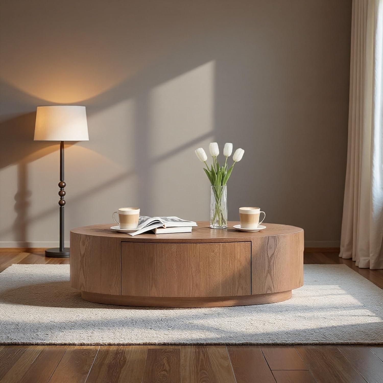 This modern coffee table is designed to elevate everyday living spaces with its soft, minimalist form and natural wood texture. Whether placed in a living room, apartment, bedroom, or office, it creates a calm and stylish centerpiece for daily use. The smooth-edge tabletop and sculptural base bring a balanced visual presence that pairs effortlessly with sofas, lounge chairs, and sectional seating. As a center table or accent table, it offers the perfect surface for coffee cups, books, decorative objects, or relaxed conversations. Crafted from high-quality MDF with a realistic wood grain finish, this small coffee table combines durability with a warm, organic aestheticโmaking it an ideal choice for modern and contemporary interiors.