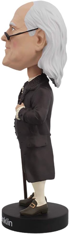 Our intricate bobblehead portrays a lifelike image of Benjamin Franklin, a Founding Father of the US. He was a legendary inventor. Ben Franklin invented the lightning rod, bifocals, the Franklin Stove, and a carriage odometer. Royal Bobbles features several different product lines of famous icons including entertainers, artists, and historic/political figures. Each features an authenticity hologram with a unique serial number. Each premium bobblehead comes in a colorful collector’s box with a custom-cut Styrofoam inner protection. Each over 8” tall, made from high quality, heavyweight polyresin, and individually hand-painted. As each bobblehead is carefully researched, crafted with care, and extremely detailed. Royal Bobbles is leading the industry with its realistic and lifelike likenesses, making them right at home in any environment.Founded in 2009, Royal Bobbles is a premium designer and manufacturer of high quality, exquisite collectible figurines, allowing for a high level of detail and durability in every product.