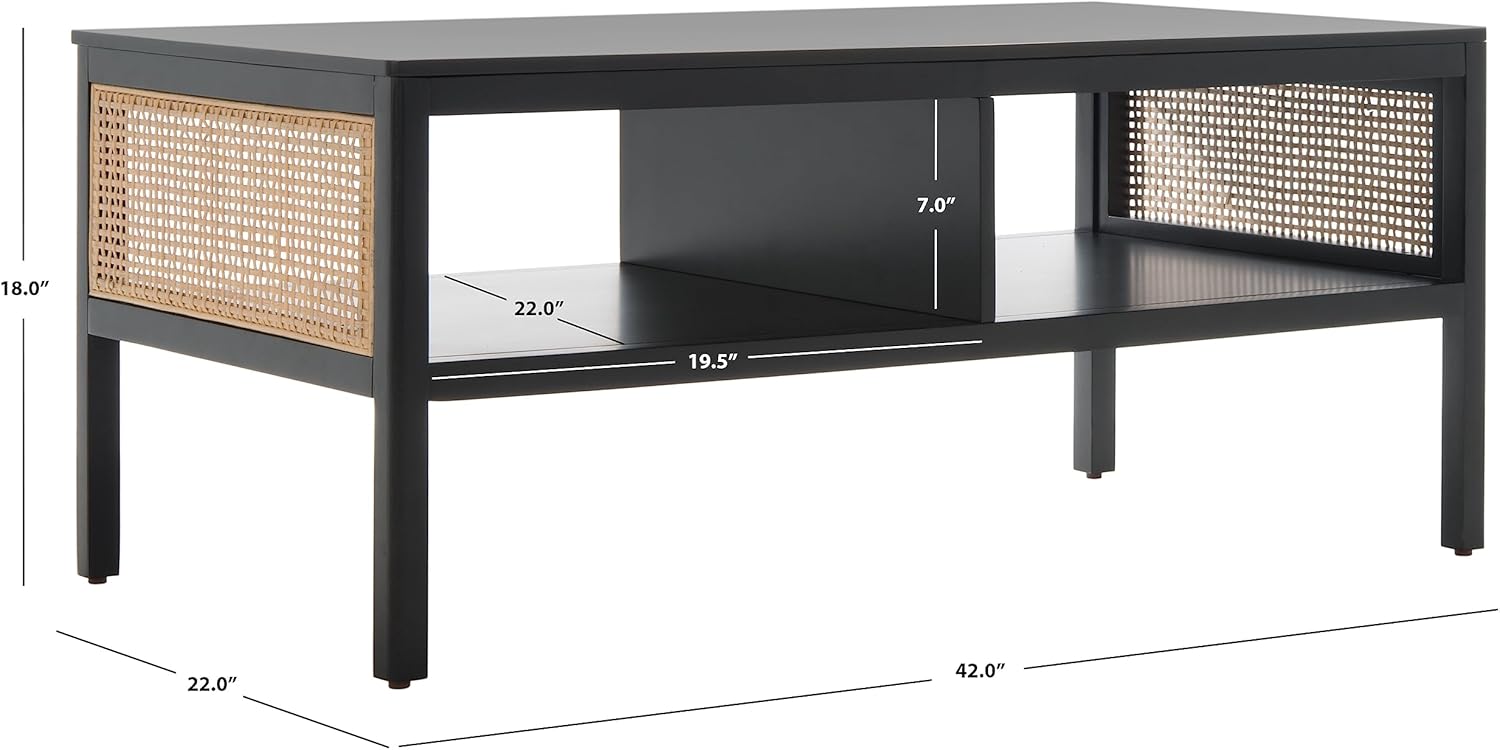 Make a warm and refined statement with our stylish Miya coffee table. Our sleek and streamlined coffee table stands out with a rich textural appeal. A beautiful rattan mesh is juxtaposed against a black and natural veneer to serve as a warm and inviting centerpiece. Its minimalistic profile evokes relaxed refinement to sit easily in your casual living space, family dens, and bedroom. Our coffee table features two large open shelves to keep your remotes, coasters, and other essentials within easy reach.