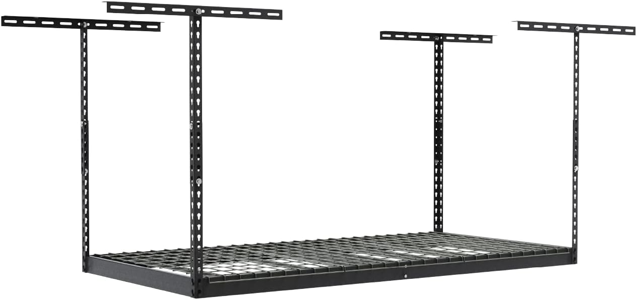 Purchases from SafeRacks includes a Limited Lifetime Warranty. Description: SafeRacks 2' x 8' Overhead Garage Storage Rack is designed to help utilize wasted space in your garage. Our patented design holds 400 pounds and we back it up with a lifetime warranty. Customize the ceiling drop-down distance between 12”-45” from the ceiling by selecting the applicable drop-down. If you need a longer distance from the ceiling, check out our related products. We use only industrial quality steel and complete our product with a powder coat finish. Step-by-step instructions with a support staff for all your questions. Pictured here is one 2' x 8' unit, various hook accessories and loaded items not included. INDUSTRY WARNING: 600 Pounds is the maximum your garage ceiling can withstand. SafeRacks is engineered at well over 1,500 pound breaking strength. *NOTICE: Consult with builder if you have metal joists or i-beams before buying.