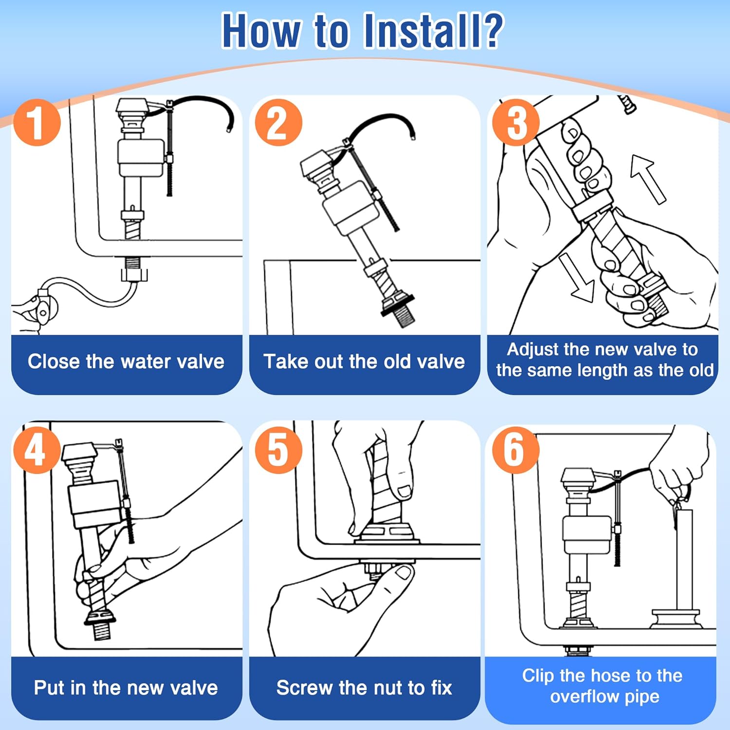 12 Pack Toilet Fill Valve Replacement >>How to know if the toilet fill valve of a toilet tank is damaged 1. Water keeps flowing into the toilet tank and out of the overflow pipe. 2. Water does not enter the toilet tank, or the water flow is too slow. 3. The noise of the water inflow is too loud. >>Why Choose us 1. Universal Toilet Fill Valve Fits like the original, this universal toilet fill valve replacement kit has a US standard G15/16" inlet that fits most American toilets. The sleeve offers 813'' height adjustment to adapt to taller or shorter toilets tank. 2. Long Service Life Made of premium POM and PP material, the toilet flusher replacement kit has good corrosion resistance, can be used for 200, 000 cycles, the quality is reliable. There is a filter inside the water inlet to avoid impurities from entering the tank, which can be removed and cleaned when necessary. 3. Easy to Install This toilet float replacement kit is very easy to install, no problem for one person. According to the picture, remove the old toilet valve, adjust the new one to the same length as the old, then install it inside tank. Finally, just adjust the red valve to control the amount of water to be replenished. >>Package Included 12 x Toilet Fill Valve --- Height adjustable 8 to 13'' US standard G15/16" inlet