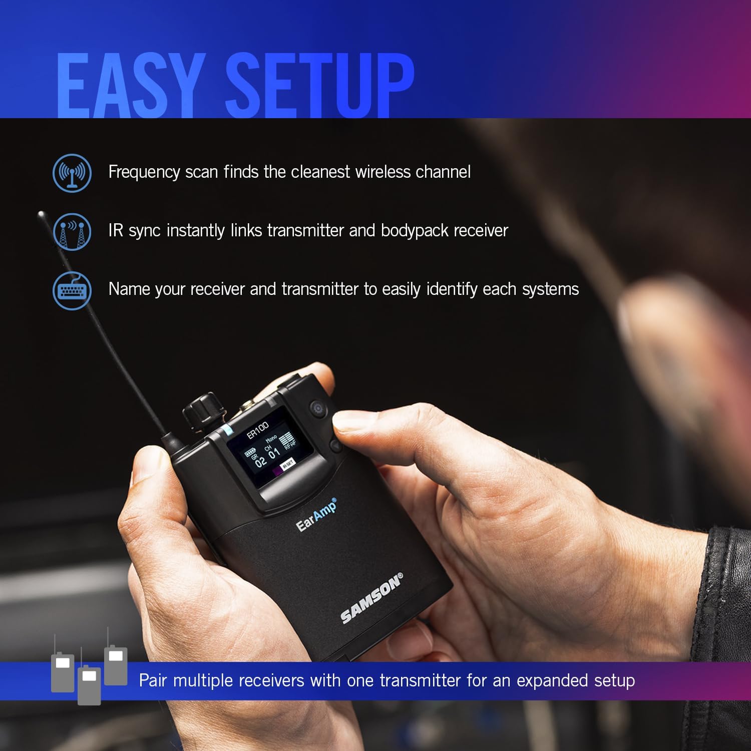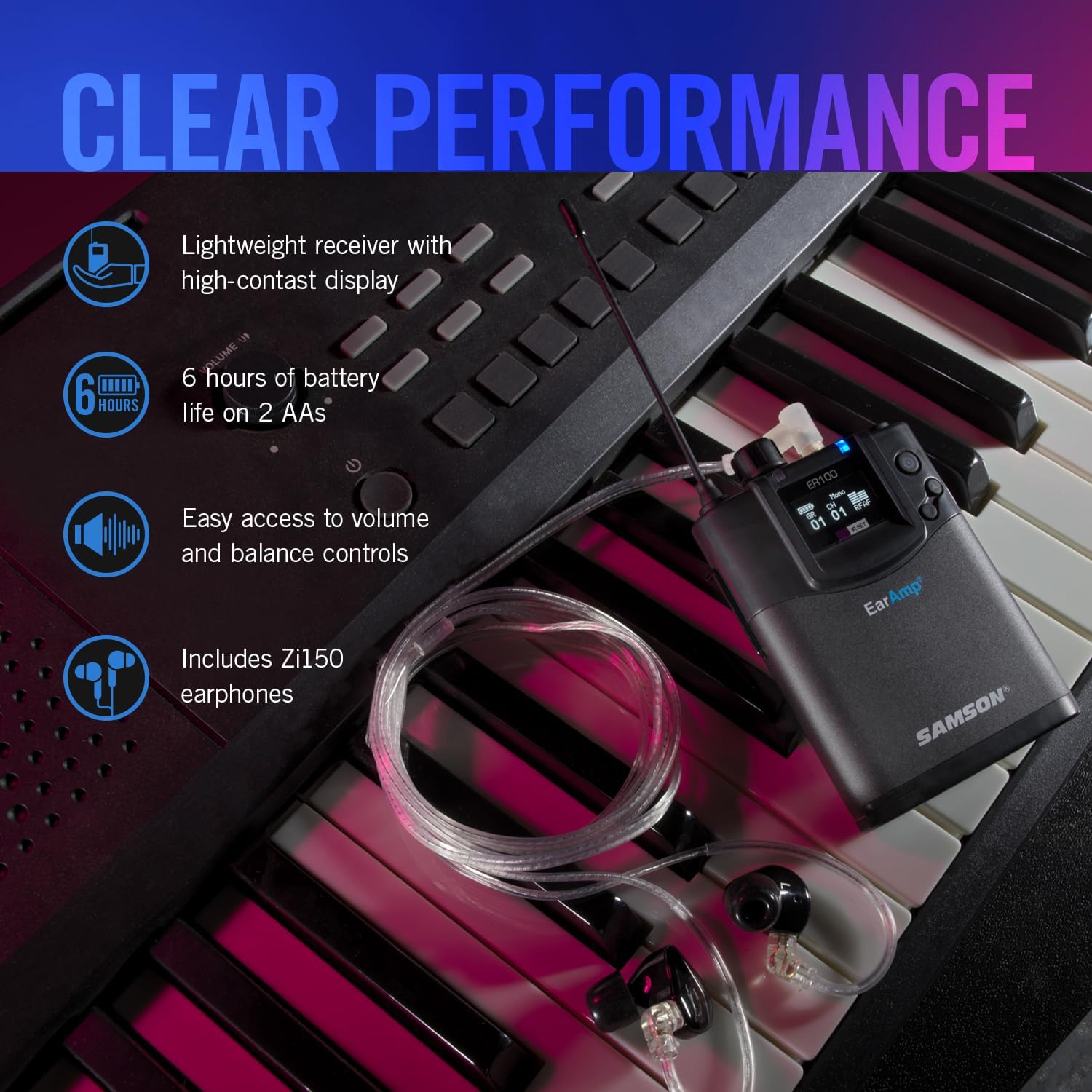 "The Samson EarAmp® is a stereo wireless in-ear monitoring system that delivers exceptional audio with superb clarity and is the essential solution for personal monitoring and freedom on stage. Designed for musicians, singers and presenters, the EarAmp enhances performance, reduces stage clutter and provides a comfortable and protected listening experience.With customizable mixes, reliable wireless connectivity and no stage monitors, the EarAmp empowers performers to deliver their best performances with confidence and precision. From the concert hall to the house of worship, our wireless in-ear monitoring system is the trusted choice for professionals seeking unparalleled sound quality and stage versatility. The ER100 receiver is a compact stereo bodypack that's both comfortable and versatile. It is equipped with a 1/8"" stereo output connector for use with in-ear monitors. The display provides clear visibility of settings and operating status. The receiver features a large volume knob for easy adjustment and controls to activate the high EQ shelf, limiter, balance and stereo/mono operation, allowing performers to customize their monitoring experience. Powered by two AA batteries, it provides up to 6 hours of continuous operation for reliable performance during rehearsals and performances. The ET100 transmitter features a rugged metal 1/2 rack receiver for durability in demanding environments. There are two XLR-1/4"" combo inputs and two 1/4"" output jacks for daisy-chaining systems or routing the signal for additional feeds. A 1/4"" headphone jack allows convenient monitoring of the transmitted signal. The ET100 can be easily set to transmit stereo or mono signals, providing flexibility for different audio setups. The high-contrast display provides clear visibility of settings, while the transmitter naming feature makes it easy to identify and organize multiple transmitters in a setup. The included Zi150 earphones deliver exceptional sound quality and impressive dynamics. Equipped with three foam and three rubber ear tips, they provide a secure and comfortable fit. Designed for all-day comfort, the foam tips conform to the shape of your ear and provide a better grip than silicone tips. This keeps the earphones in place and provides effective isolation from ambient noise so you can focus on your performance."