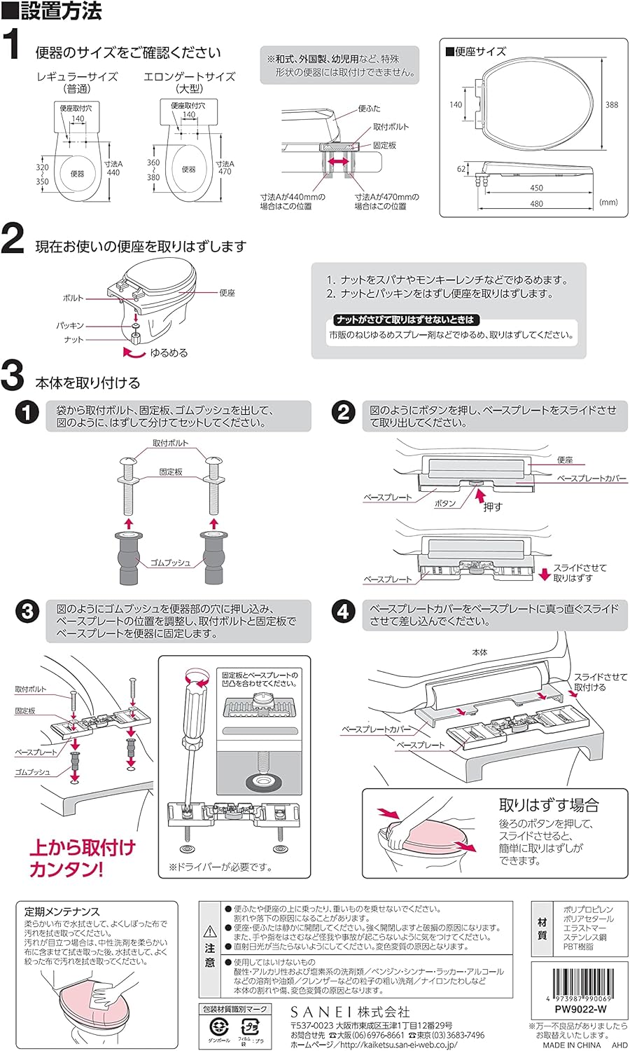 Do not place on toilet lid or toilet seat or place heavy items. It may cause cracking or falling down. Please gently open and close the toilet seat and toilet lid. It may cause damage to the product if it is opened or closed too tightly. Also, be careful not to cause injuries or accidents such as holding your hands or fingers. Please avoid direct sunlight. This may cause discoloration. Items that must not be used: Acidic, alkaline and chlorine detergents / coarse detergents such as benzene, thinner racker, alcohol, and other particles such as oil, cleansers, and nylon scrubbing may cause cracking and discoloration.