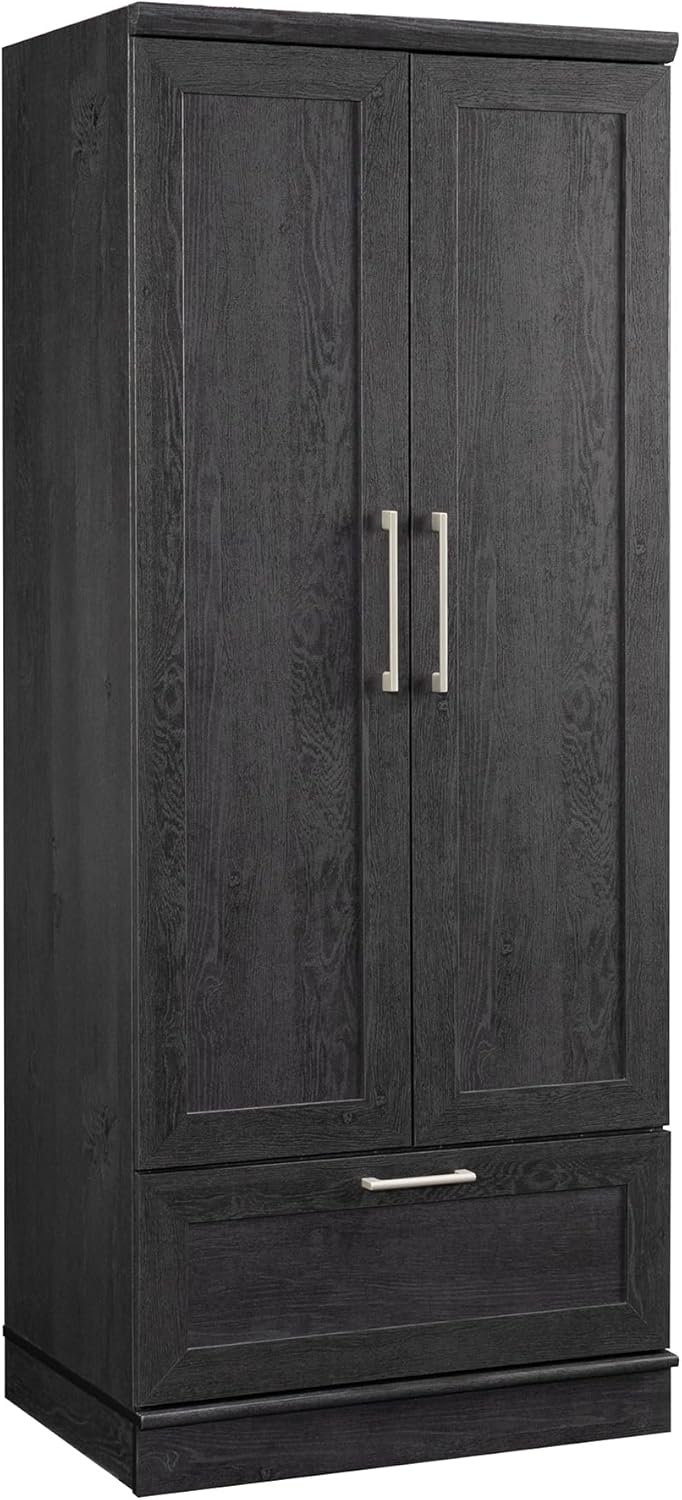 The perfect blend of style and functionality. This wardrobe/storage cabinet from the Sauder Select collection is just what your home has been looking for. Behind its two framed panel doors, it features a garment rod, an adjustable shelf and an easy gliding storage drawer. Other features include adjustable base levelers and an enclosed back panel with cord access. Finished in Sienna Oak, this handsome cabinet is the solution to all your storage woes.