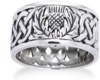 Symbolic to Scotland, this wide band has detailed thistles separated with braided Celtic knotwork. This band is very sturdy, 11mm wide, and crafted of nickel free sterling silver.