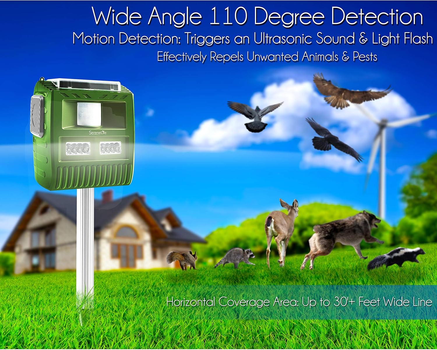 SereneLife Model : AZPSLBAR8Waterproof Solar Power Animal Repeller, Outdoor Electronic Motion Detector Alert Sensor, Pest ControlFeatures:Effectively Repels Unwanted Animals & PestsMotion Detection: Triggers an Ultrasonic Sound & Light FlashBuilt-in Speaker Emits a Safe Ultra-High Frequency AlertRugged Marine Grade Waterproof ConstructionWorks Day or Night: Built-in IR Infrared Detection SensorBattery Powered (4 x 'AA'), Rechargeable Batteries Included Automatic Charging via Built-in Solar Panel (2) Mounting Options: Wall Mount or Outdoor In-Ground MountingWorks for Unwanted Bats, Birds, Pigeons, Pests, CrittersPerfect for Gardens, Front Yards, Back Yards, Flowering AreasTechnical Specs:Horizontal Coverage Area: Up to 30'+ Feet Wide LineWide Angle 110 Degree Detection (6) Selectable Alert SoundsFlash Brightness: 320 LumenMarine Grade Waterproof Rating: IP-44Ultrasonic Frequency: 12-35kHzPower Consumption: 80mAh Dimensions (with Spike): 6.2'' x 16.2'' x 4.0''The Serene Life Solar Power Animal Repeller provides convenient pest control. The system uses motion detection technology that triggers an ultrasonic sound and light flash that effectively repels unwanted animals. The built-in speaker emits a safe ultra-high frequency alert which startles animals and prevents them from returning to the scene. It works in the day or night time thanks to the infrared detection sensor. Built-in solar panel allows for smart self-charging when in direct sunlight. Perfect for use in gardens, yards and flowering areas.