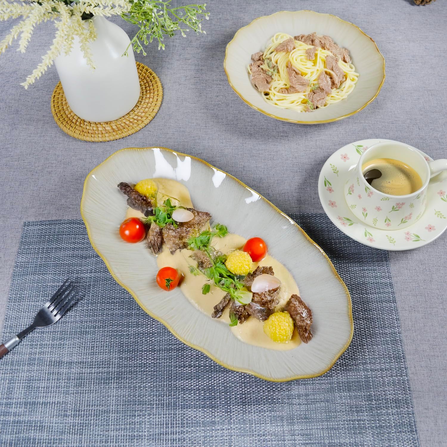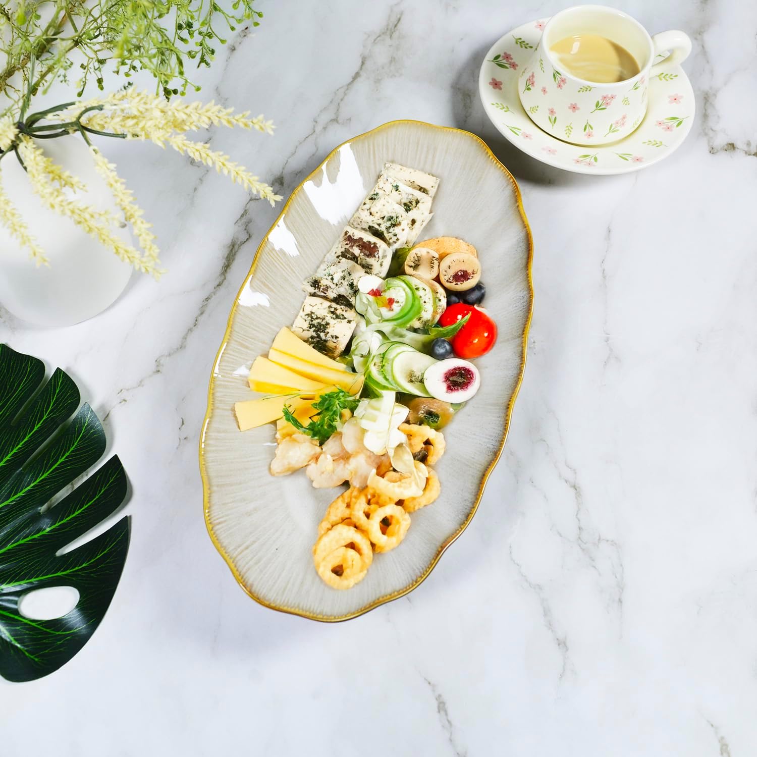 Set of 4 Large Plates: 14.4 x 7.6 inches, Capacity: 34 Fluid ounces. These plates can be used for serving food, turkey, roast chicken, vegetables, cakes, crackers, cheese, appetizers, steak, fish, sushi, desserts, fruit, salads, bread, cupcakes, sandwiches, and chips, even for foods with sauces. Meet Everyday Need: Our big plates meet all of your need during your daily life, these decorative serving platters are perfect for serving food dinner party entertaining, family, restaurant, The beautifully glazed plates make a wonderful gift to commemorate new beginnings and cherished moments. Microwave Oven Proof: These Serving Trays Are Made Of Durable Porcelain, Chip-Resistant And More Sturdy Than Stoneware, Oven Safe To 482°F, And The Oval Ceramic Serving Grill Platter Be Used In The Oven, Microwave, Refrigerator And Dishwasher Unique Natural Glazed: The Glazed Ceramic Serving Platter Are Durable, Lead-Free And Eco-Friendly, Ideal In The Kitchen For Everyday Use, Easy To Clean With Dishwasher Or Even Hand Wash With Soap And Water Our Promise: If your dinner plates are damaged during shipping, we promise to replace them. Simply leave us a message on Amazon, and we'll respond to your request daily. We're committed to creating healthy and safe tableware, making every cooking and dining experience a heartwarming experience.