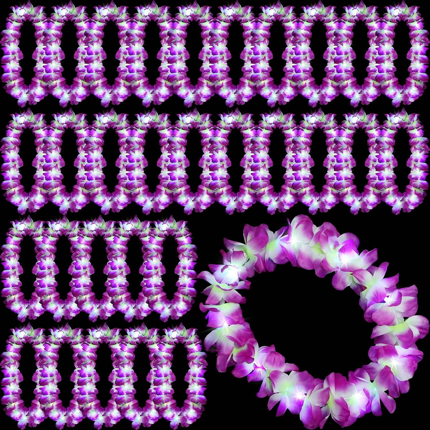 Features: Very attractive decorations: These leis are very bright and beautiful. Wearing them on various parties such as tropical beaches can attract people's attention and make you more beautiful. Such a romantic gift: There are 24 pieces in this set, the quantity can fully meet your own needs, and you can also give it as a gift to your dear family and friend around you. This will be a very romantic gift. These colors are romantic and a symbol of happiness. Specifications: Material: cloth Color: as pictures show Size: approx. 39.37 inches/ 100 cm Package includes: 24 x LED Hawaiian leis light up flower leis Notes: Manual measurement, please allow slight errors on size. The color may exist a slight difference due to different screen displays.