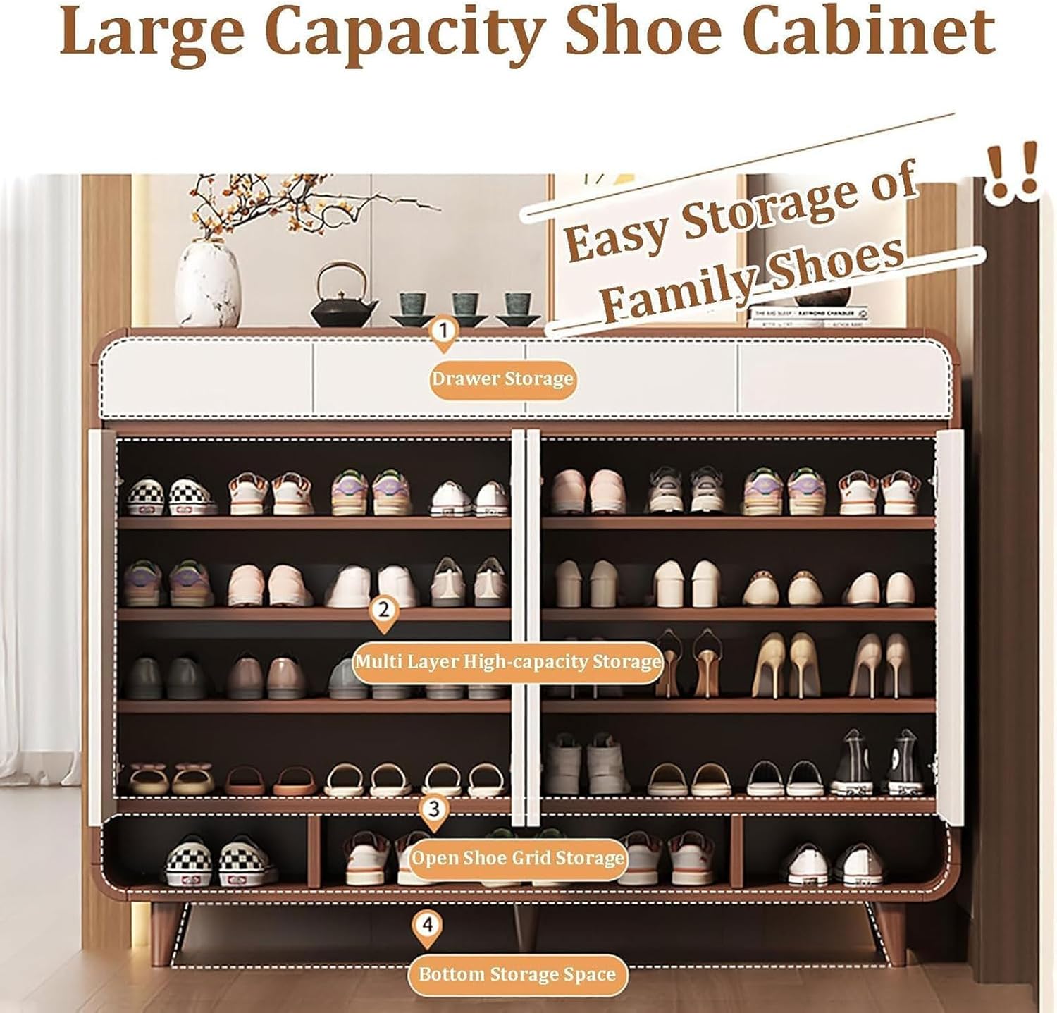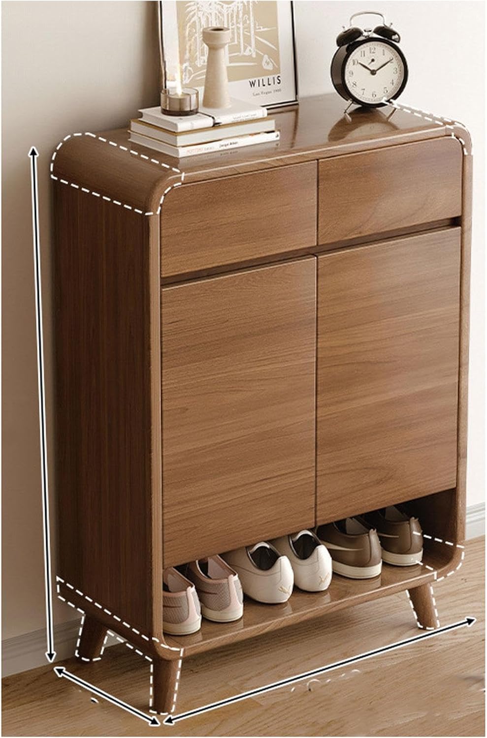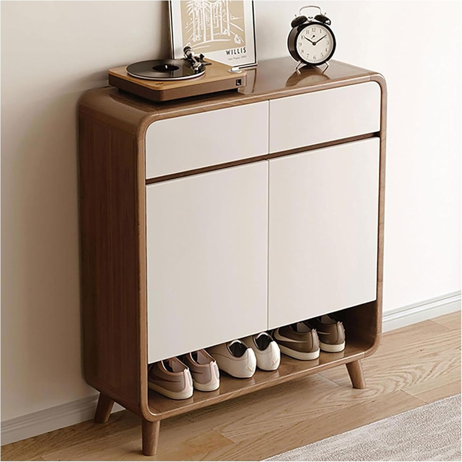 Elevate your home nization with our versatile shoe rack, designed to enhance both functionality and aesthetics in your living space. This solid wood shoe cabinet not only provides ample storage for your footwear but also contributes to a tidy and welcoming environment in your entryway, hallway, or bedroom. Crafted fromsolid wood, our shoe rack is available in elegant brown and white finishes, seamlessly fitting into any decor style. The multi-layer design optimizes vertical space, allowing you to store multiple pairs of shoes without taking up excessive floor area. Choose from various configurations, including options with two or three drawers and doors, to meet your specific storage needs. Imagine stepping into your home to find your shoes neatly nized, making it easy to grab what you need on the go. This shoe rack is perfect for busy families, providing a designated spot for everyone’s footwear, reducing clutter and making your space feel larger and more inviting. Please note the following considerations: 1. Size may vary slightly due to different measuring methods, with a normal error margin of 1-3cm. Minor gaps may appear after installation, which do not affect functionality. 2. Color variations may occur due to lighting and production differences, so please refer to the actual product for accurate color representation. 3. The edge sealing of the product is a standard manufacturing process, ensuring durability without compromising aesthetics. Transform your shoe storage experience with our stylish and practical shoe rack, and embrace a more nized and beautiful lifestyle today.