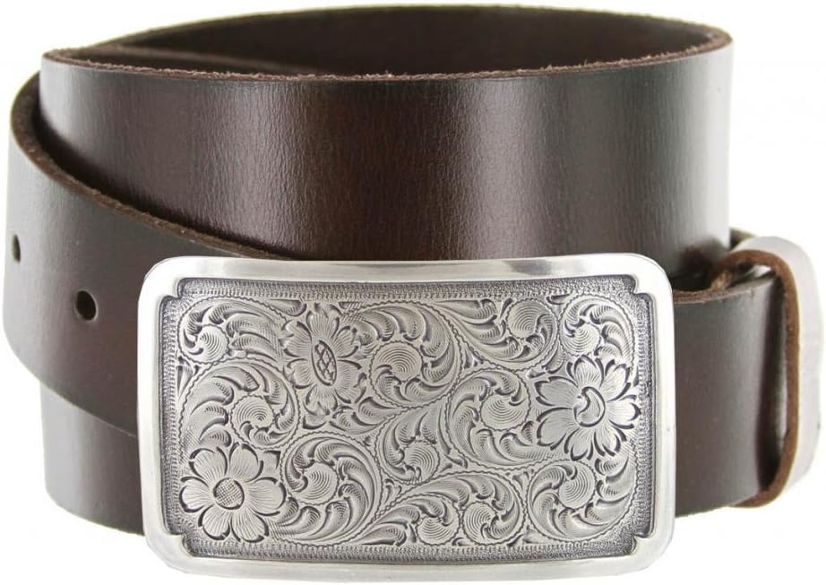 Merticulously-crafted Solid Metal Buckle with Intricate Western Designs Engraved in a Sterling Silver Finish. 100% Cowhide solid leather jean belt Available in Black, Brown Tan, and White from Sizes 32" to 44". Questions? Call Toll Free: 1-888-692-3587.
