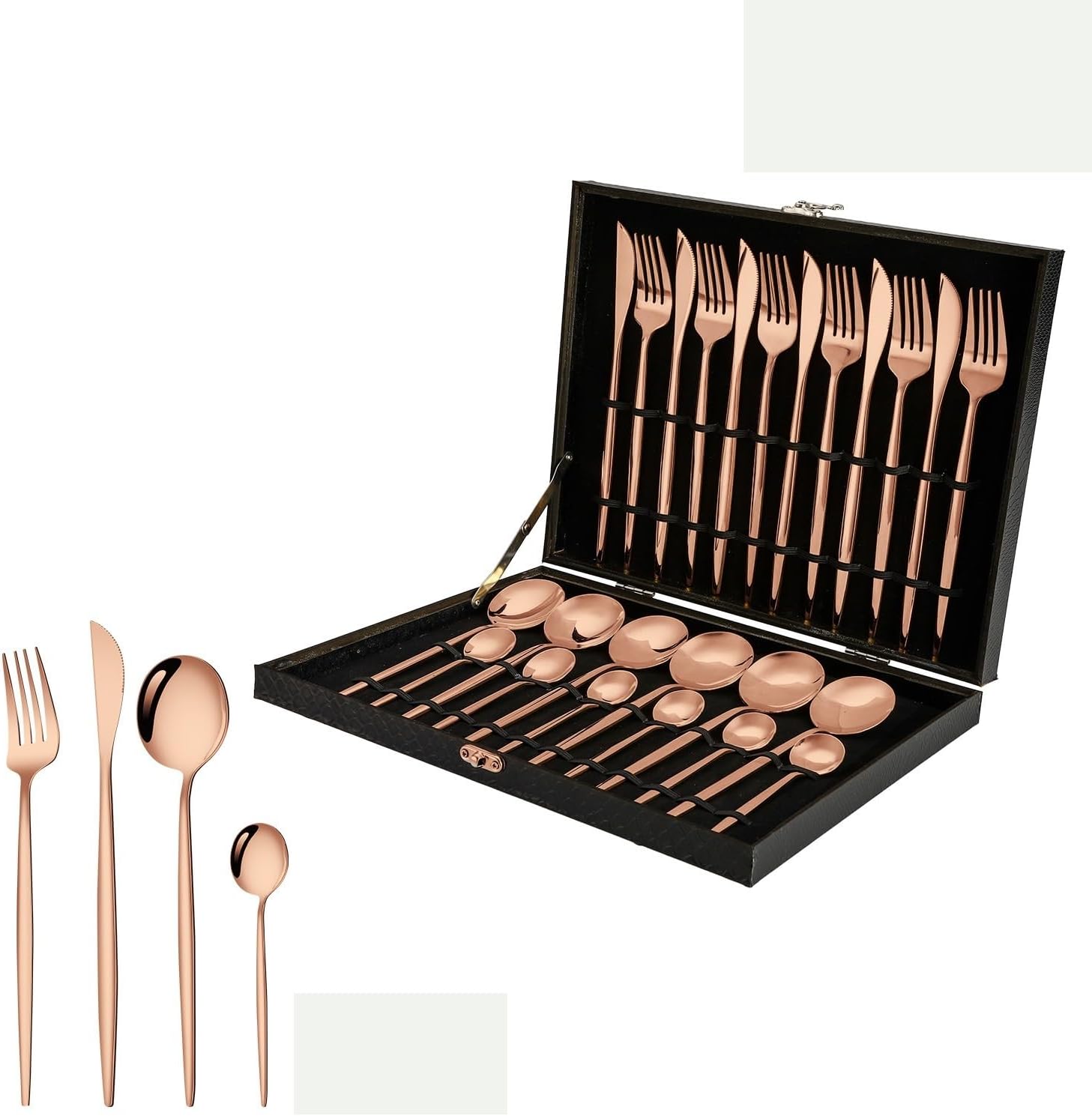 Item No.: Portuguese tablewareMaterial: Stainless steelPolishing process: cloth wheel polishing (mirror polishing)Set list: knife/fork/spoon/dessert spoonStyle: Modern and simpleStainless steel material: 410 stainless steelSpecifications: [Silver] 24-piece set (including black leather box)Specifications: [Gold] 24-piece set (including black leather box)Specifications: [Rose gold] 24-piece set (including black leather box)Specifications: [Rainbow Color] 24-piece set (including black leather box)Specifications: [Black] 24-piece set (including black leather box)Specifications: [Black and Gold] 24-piece set (including black leather box)Specifications: [Green Gold] 24-piece set (including black leather box)Specifications: [Pink Gold] 24-piece set (including black leather box)Specifications: [Red and gold] 24-piece set (including black leather box)Specifications: [Blue and gold] 24-piece set (including black leather box)Specifications: [White Gold] 24-piece set (including black leather box)Product quality grade: first-classStyle: Modern and simpleColor: Silver/Gold/Rose Gold/Rainbow/BlackStyle type: Simple styleProduct category: Knife, fork and spoon set.About our BrandOur brand is GOODJAYVEN. We have always been committed to Household items. Do our best to bring more creative products to our customers.
