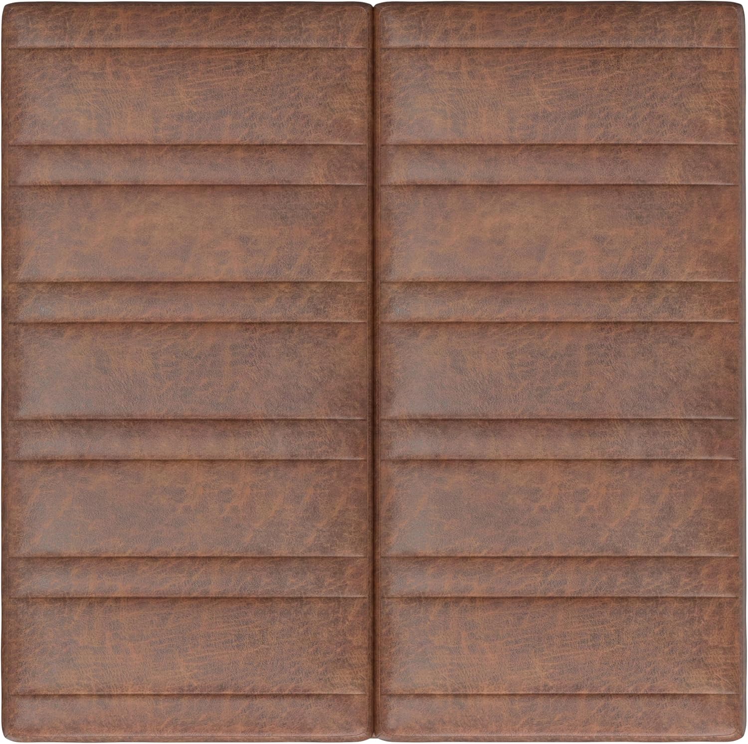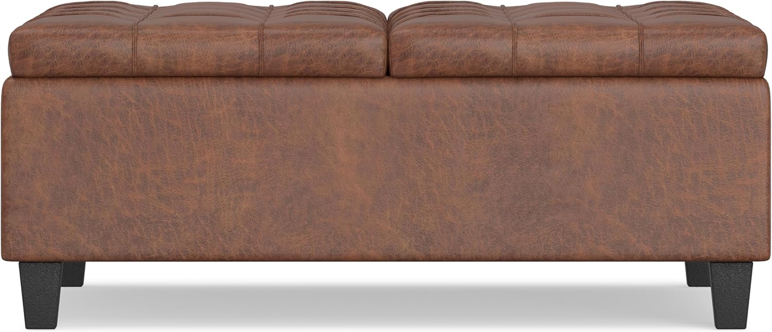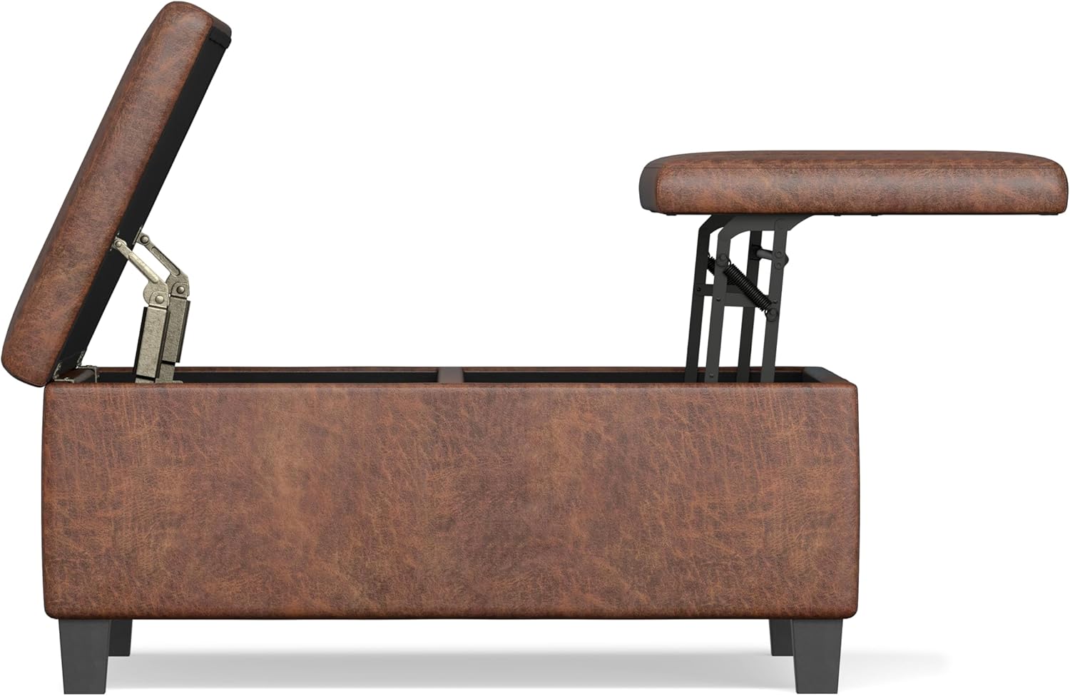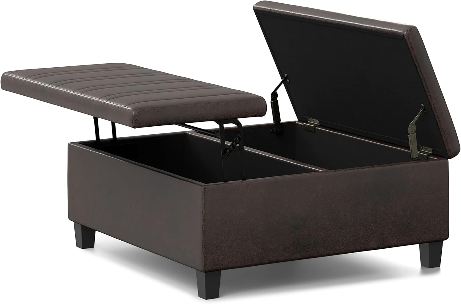 The Ellis 36-inch Square Coffee Table Storage Ottoman brings modern functionality and clean style to your home. Handcrafted from solid and engineered wood, this versatile piece is cushioned with high-density foam and upholstered in distressed saddle brown vegan leather with refined vertical stitching. The innovative split lift-top design allows one section to rise for laptop use or casual dining, while the other provides easy access to a generous storage compartment. Whether used as a coffee table, footrest, or extra seat, the Ellis Ottoman delivers reliable performance and organized storage without compromising on contemporary design.