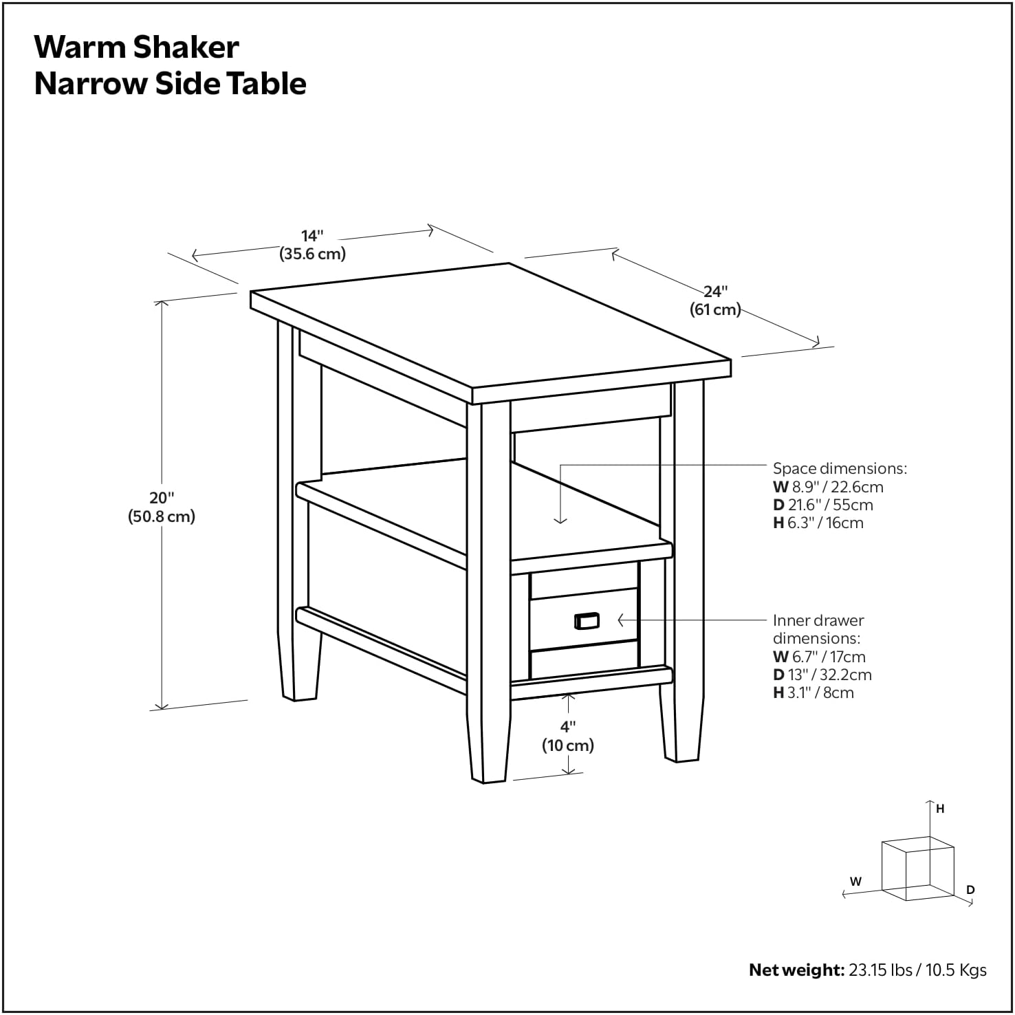 The Warm Shaker Narrow Side Table offers practical storage in a compact design that fits effortlessly into tight spaces. Measuring 14 inches wide and 20 inches high, this handcrafted end table is built from solid wood and finished in a light golden brown stain sealed with protective NC lacquer for enhanced durability and a smooth surface. A single drawer with a smooth metal glide offers hidden storage for everyday essentials, while a lower open shelf provides space for books, baskets, or decor. Transitional details like a brushed knob, square tapered legs, and a square-edged tabletop bring timeless style to any room. Whether used beside a sofa, bed, or reading chair, this slim-profile table adds functionality and classic charm to your living space.