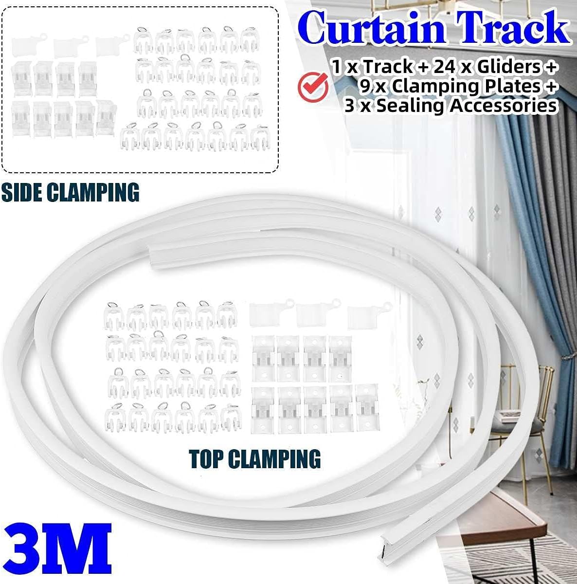 SPECIFICATIONSMaterial: Plastic+SteelColor: WhitePatterns: Top clamping, Side clampingTrack Length: 3 meters(10ft)FEATURES Adjustable characteristic to be used as a curved track/straight track. Top clamping plate and side clamping plate meet your different needs The outer layer is nano-plastic, with steel sheets inside, good mute effect. Specailly designed for the bay window/balcony/toilet, and any other place. Flexible and changeable, The corner can use U, L, Z, arc, circle for installation. Track contains sheet steel, capricious super strong, easy to operate and can achieve a wide range of bending, gliders can easily across the surface.PACKAGE INCLUDED1 x Track24 x Gliders9 x Clamping Plates3 x Sealing AccessoriesInstruction is not included. Hope a nice day!