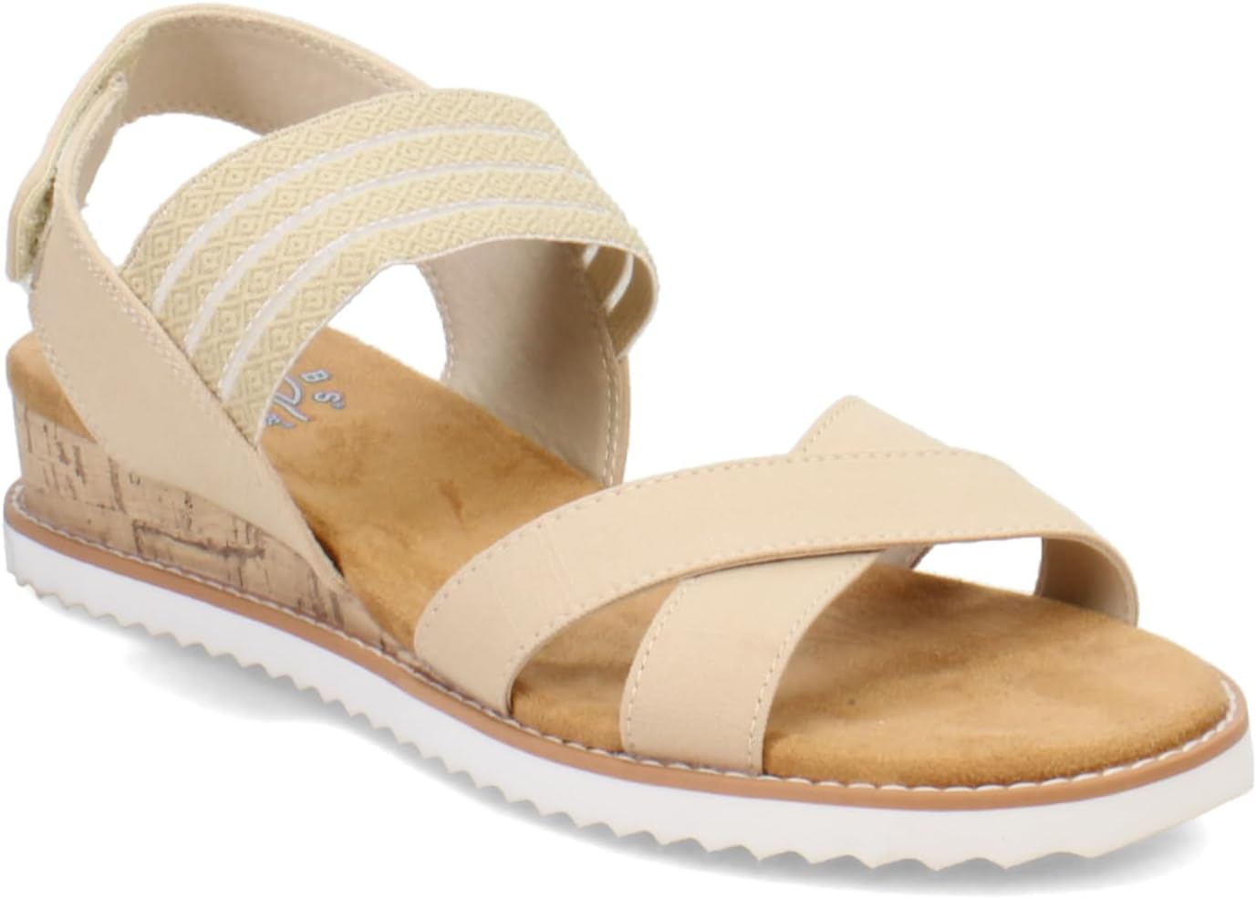 Get warm weather ready wearing Bobs from Skechers Desert Kiss - Shore Enough. This vegan fashion wedge sandal features a canvas cross strap upper with a breathable mesh instep, adjustable sling back strap closure, cork veneer midsole trim, plush a cushioned Skechers Memory Foam footbed. For every BOBS purchase, a donation is made to animals in need.