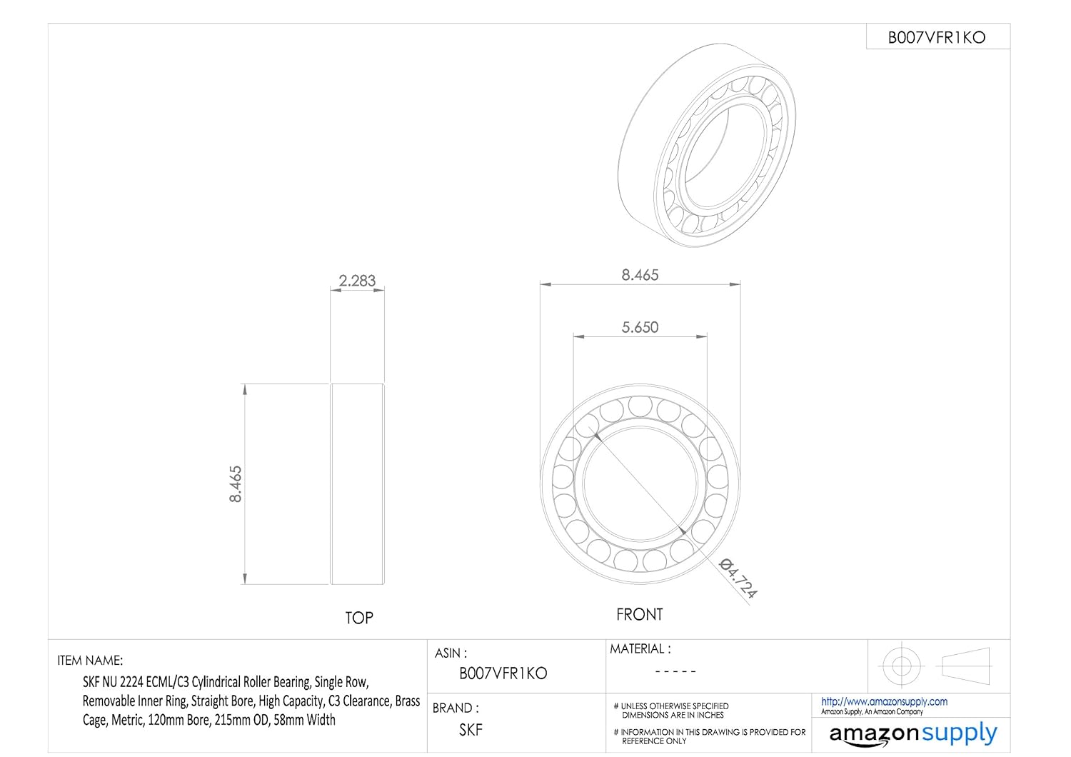 This SKF cylindrical roller bearing with a brass cage and removable inner ring is suitable for applications that support high radial loads. This roller bearing has a CN (normal) radial clearance for applications and operating conditions with normal shaft and housing tolerances where thermal expansion is not a factor. This is a single row roller bearing that supports high radial loads with low friction. A removable inner ring in the open bearing allows application of lubrication. The brass cage prevents the rollers from coming into contact with each other during use, reducing friction, vibration, and noise.Cylindrical roller bearings are used in applications where high radial loads are present such as in conveyer belts, traction motors, railway car axle boxes, and oilfield mud pumps, among others.Roller or rolling bearings use rolling elements to maintain the separation between moving parts to reduce rotational friction and support radial and axial loads. They are usually composed of two rings, rolling bodies (such as bearings or cylinders), and a cage to house the parts. These elements can be one of the following types: ball, cylindrical, spherical, barrel, needle, spindle, or tapered. Rolling bearings can be open, shielded, or sealed. Sealed bearings are lubricated with oil or grease in the bearing factory, while open and shielded bearings are meant to be lubricated in place, with periodic reapplication of lubrication, based on use. The shield protects the working parts of the bearing from environmental debris that may be introduced and could reduce the ball bearing speed and lifespan. Rolling bearings are used in a range of applications from agricultural machinery to conveying equipment, robotics, dental equipment, elevators, rolling mills, ship rudder shafts, and aggregate crushers, among others.SKF manufactures bearings, seals, and lubrication systems for automotive, OEM, energy, and other and industrial applications. The company, founded in 1907, is headquartered in Gothenburg, Sweden, and meets International Organization for Standardization (ISO) TS 16949 and 9001 standards for quality assurance.