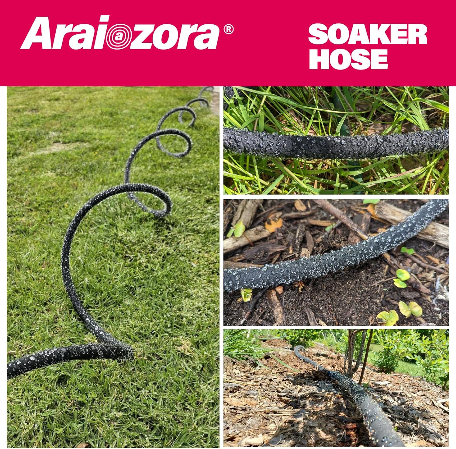 Araiozora Soaker Hose provides steady, deep root watering to support healthy plant growth. This 5/8 inch soaker hose seeps water gently along its length, directing moisture to roots without wasteful overspray or runoff. It comes in 15FT, 25FT, 50FT, and 100FT lengths to match any space. The durable, flexible build lays flat and resists kinks and UV damage for long-term outdoor use. Leak-resistant connectors work with standard garden faucets and can be linked for extended coverage. Ideal for home gardens, flower beds, yards, and landscaped areas, Araiozora Soaker Hose offers reliable, straightforward irrigation for everyday gardening needs.