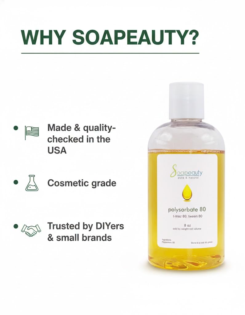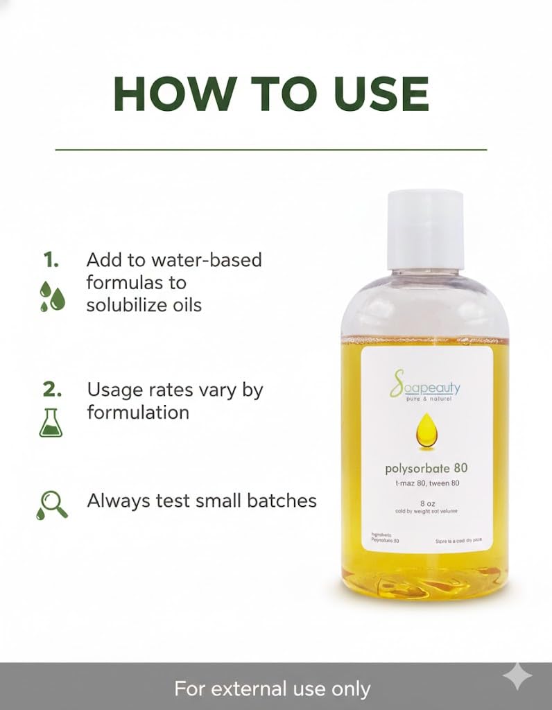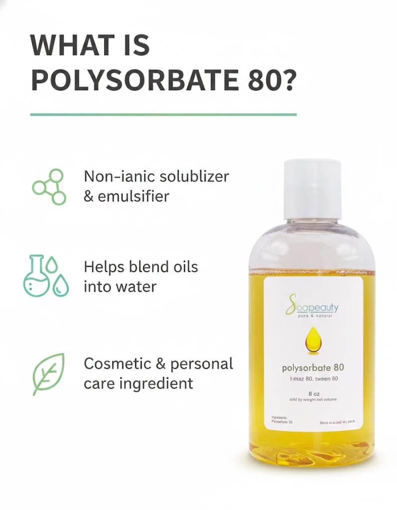 Polysorbate 80 is a solubilizer, emulsifier, wetting agent, viscosity modifier, dispersing agent, and stabilizer. Use in bath fizzies, milk bath, bath melts, furniture polish and more. Why People Use This Product: To solubilize heavier oils (such as fixed, vegetable and base oils) into water based products. Final product is cloudy. Popular Products That Use This Ingredient: Lotions. Creams. Scrubs. Hair Conditioner. Bath Oils. Room Sprays. Linen Sprays.