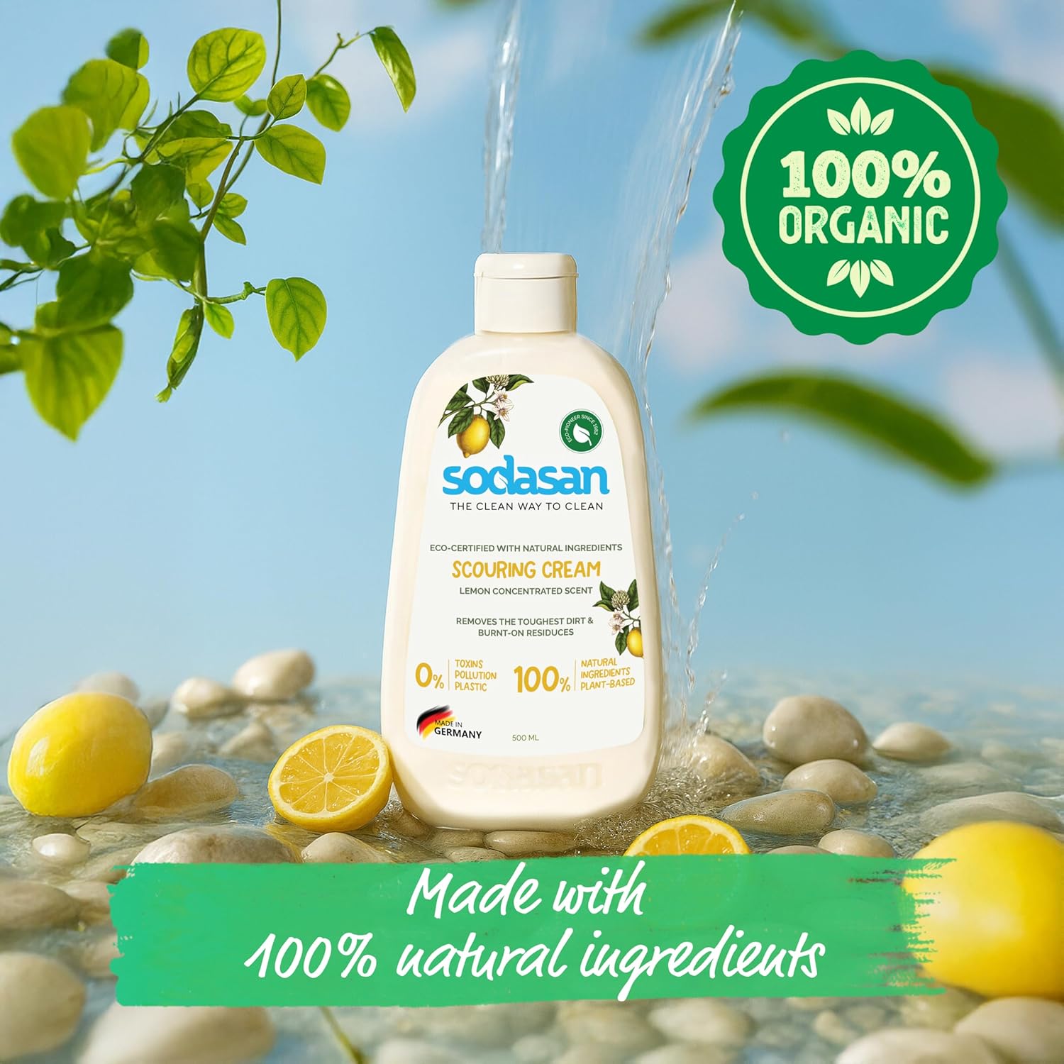 Sodasan scouring cream thoroughly cleans without scratching, all hard surfaces including enamel, ceramics, stainless steel and sanitary equipment. The scouring cream contains, scratch-free, very fine marble powder for a gentle but effective cleaning action on surfaces. Effective cleaning on all hard surfaces.