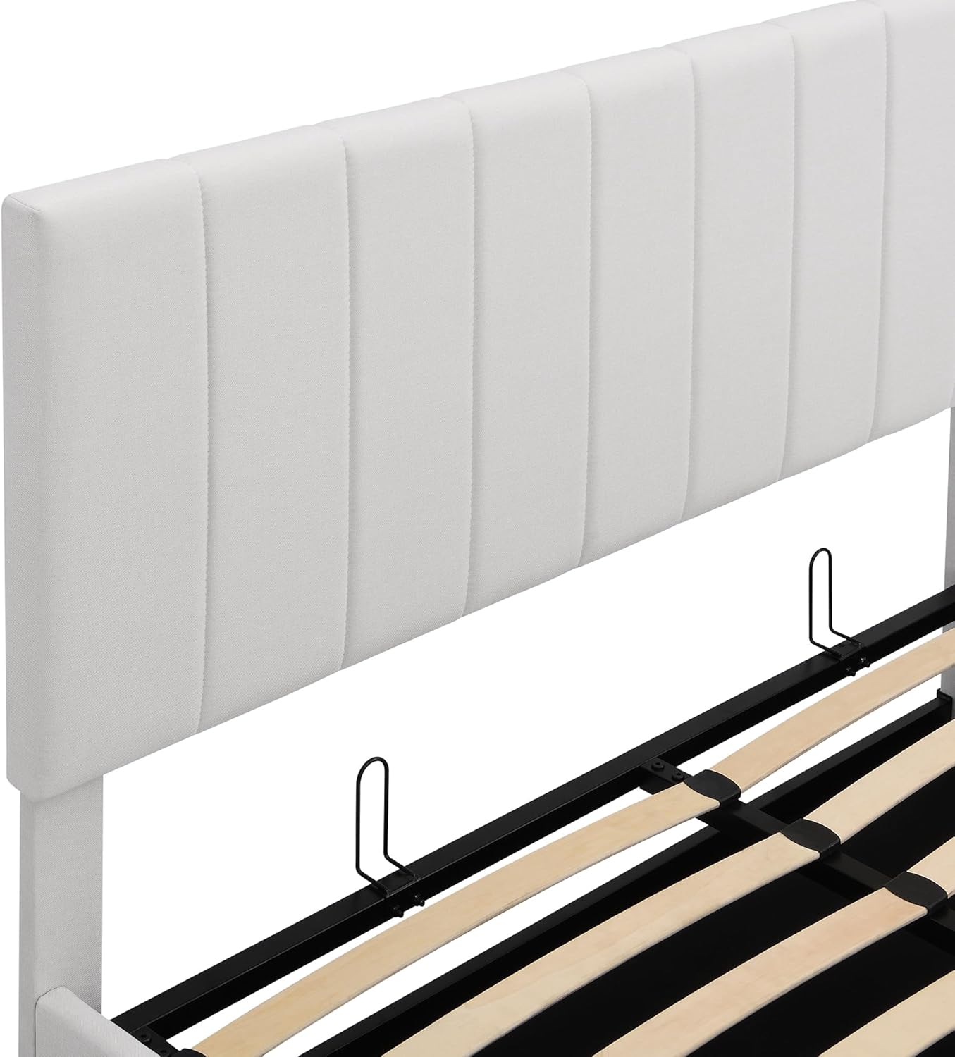 Product Description Weight & Dimensions Dimension:83"L X 64.7"W X (44.6 or 48.6)"H Overall Product Weight:96 LBS Weight Capacity:500LBS Recommended Mattress Thickness:8" Specification Product Type:Upholstered Bed Size:Queen Color:Beige/Gray/White Product material:Plywood+Pine Wood+Linen Bed slat material:Plywood Level of Assembly:Partial assembly Box Spring Required:No Mattress Included:No Number of Slats:24 Country of Origin:China Notes:Manual measurement has been used,there may be some reasonable error.All the pictures are taken by actual samples, slight chromatic aberration may occur due to lighting or display.