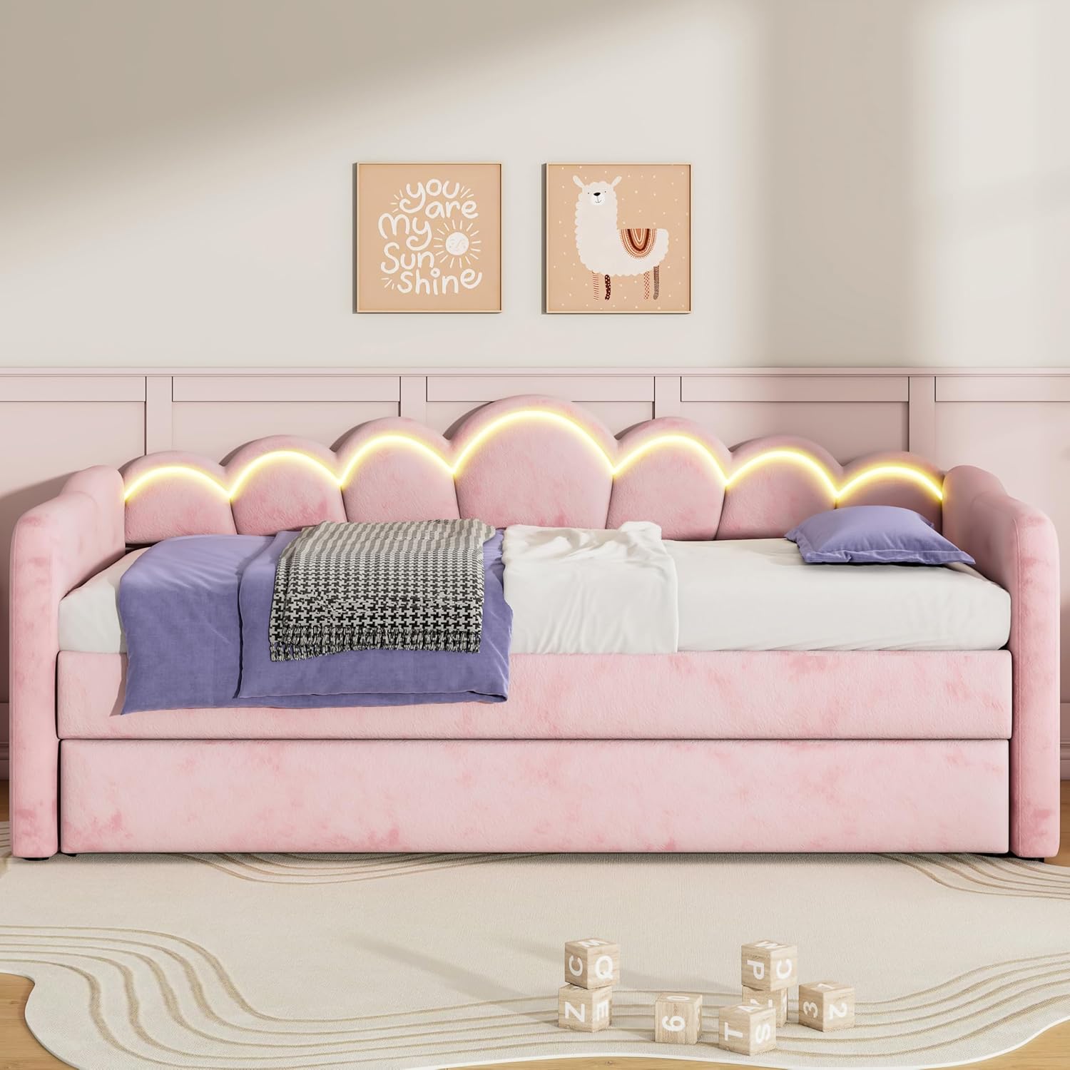 SOFTSEA focuses on providing you with high-quality furniture and is committed to bringing happiness to every buyer's life. This Twin XL daybed comes with a pull-out pop-up twin trundle that easily converts into an extra sleeping space for guests or siblings. Overall Dimensions: 85.1''L x 43.7''W x 32.7''H Bed Dimensions: Twin XL Trundle Bed Dimensions: Twin Recommended Mattress Thickness: 6 inch Color: Pink / White Bed Weight Capacity: 400LBS Overall Product Weight: 122LBSUpholstery Material: Velvet Frame Material: MDF Level of Assembly: Full Assembly Needed Suggested Number of People: 2 Additional Tools Required: All Tools Included Number of Package: 2 Country of Origin: Viet Nam SOFTSEA Notice: All colors on our website are for reference only, actual product colors may vary a little bit, due to different color settings of every screen device. Please note: most of our furniture is hand-measured, therefore the dimensions are for reference only, and may marginally deviate.