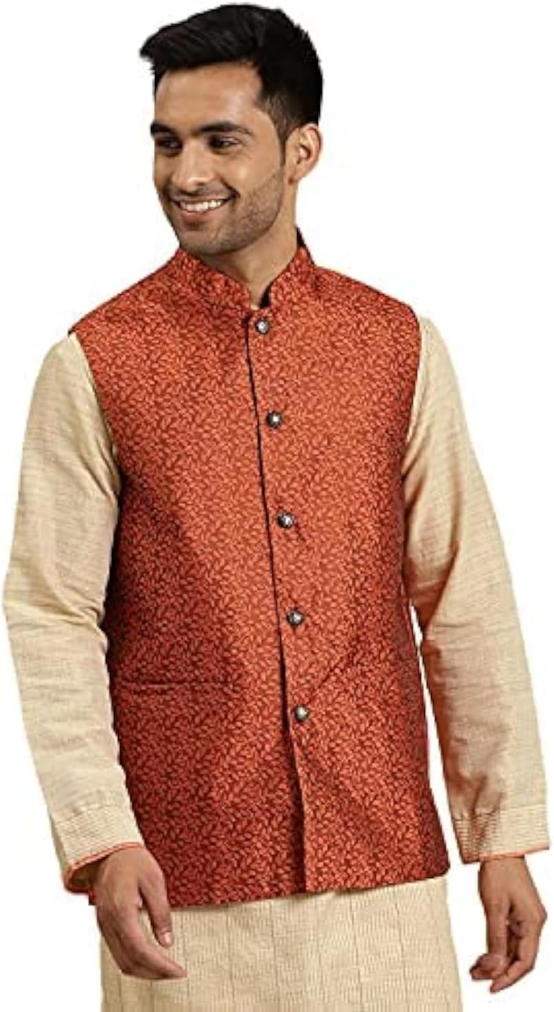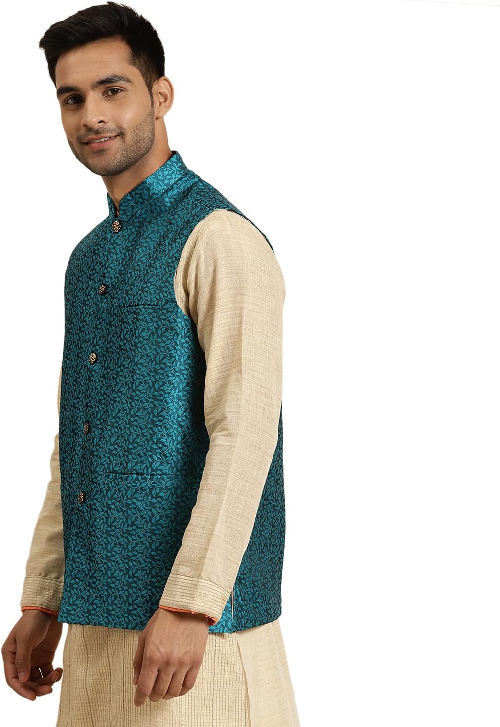 SOJANYA as a brand brings you quality and affordability. In market since 1958, we take pride in our commitment to maintain quality standards in each piece manufactured by us. This classic black nehru jacket from SOJANYA is a must have for your closet. It is made up of cotton blend fabric. Wear it with a matching shirt trouser set and brogues.