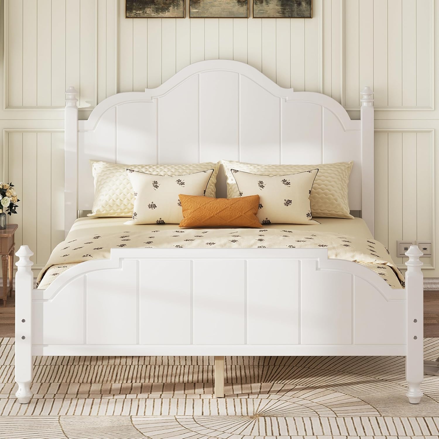 Solid Wood Bed Frame Full Size, Wooden Retro Style Platform Bed Frame with Headboard and Footboard, Heavy Duty Bed Frame with 10 Wood Slats Support,No Box Spring Needed,Noiseless (White, Full)